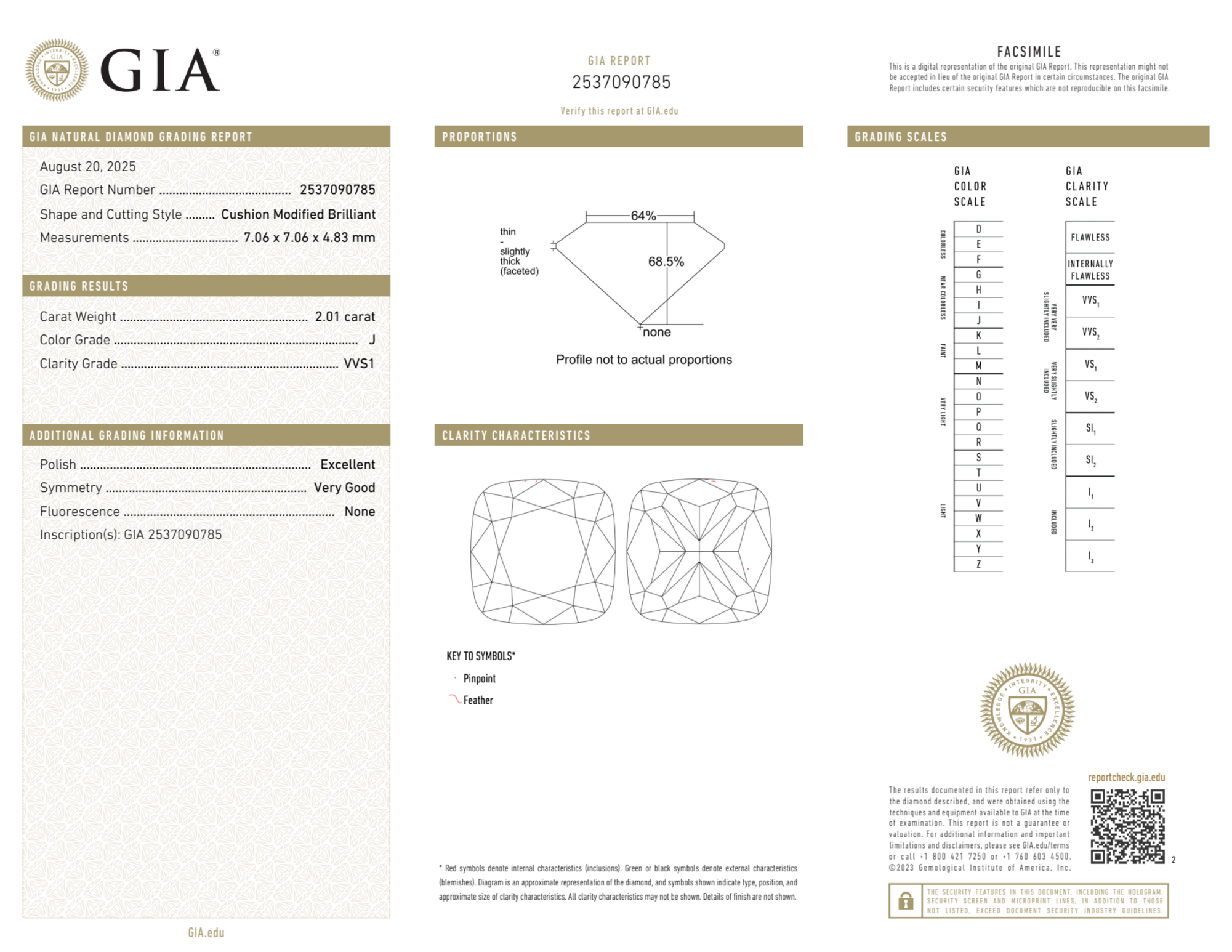 Your 2.01 carat Cushion natural diamond is graded VVS1 clarity, which stands for Very Very Slightly Included 1. Read more about VVS1 clarity diamonds here, or learn more about diamond clarity in general here.