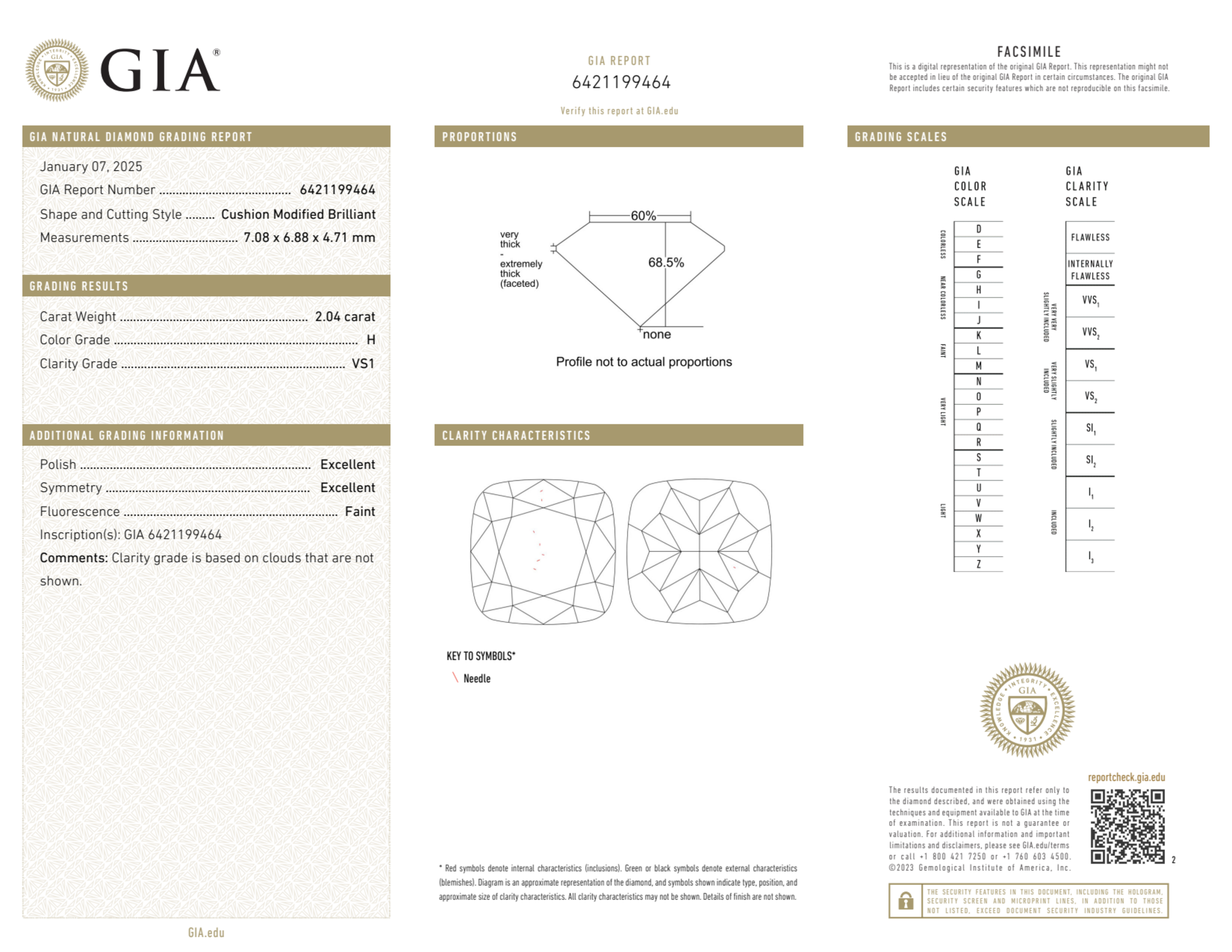 Your 2.04 carat Cushion natural diamond is graded H color (Near Colorless), and you can read more about H color diamonds here.