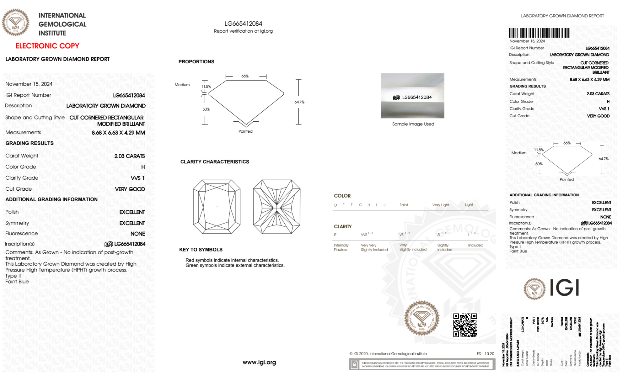 Your 2.03 carat Radiant lab diamond is graded H color (Near Colorless), and you can read more about H color diamonds here.