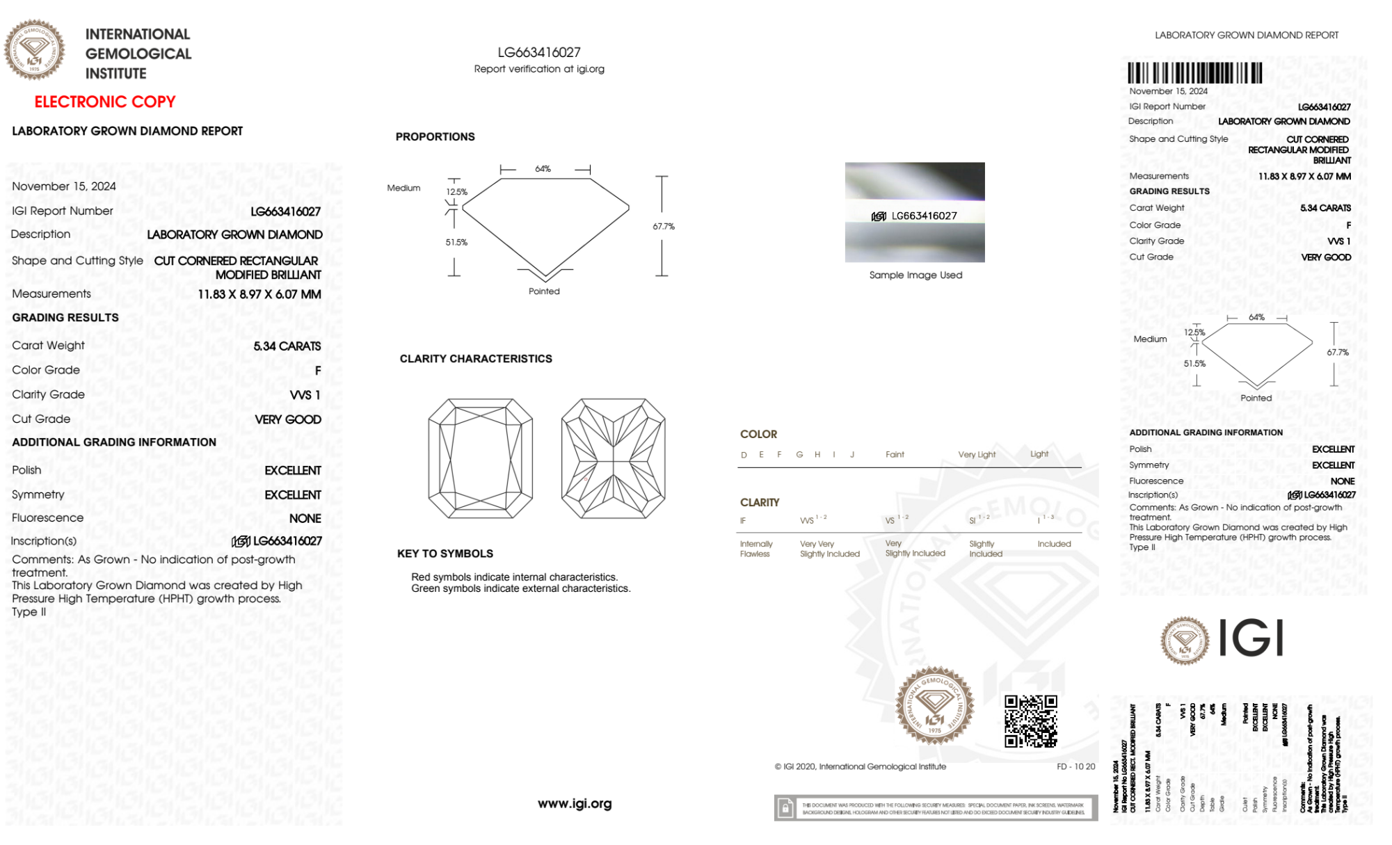 Your 5.34 carat Radiant lab diamond is graded F color (Colorless), and you can read more about F color diamonds here.