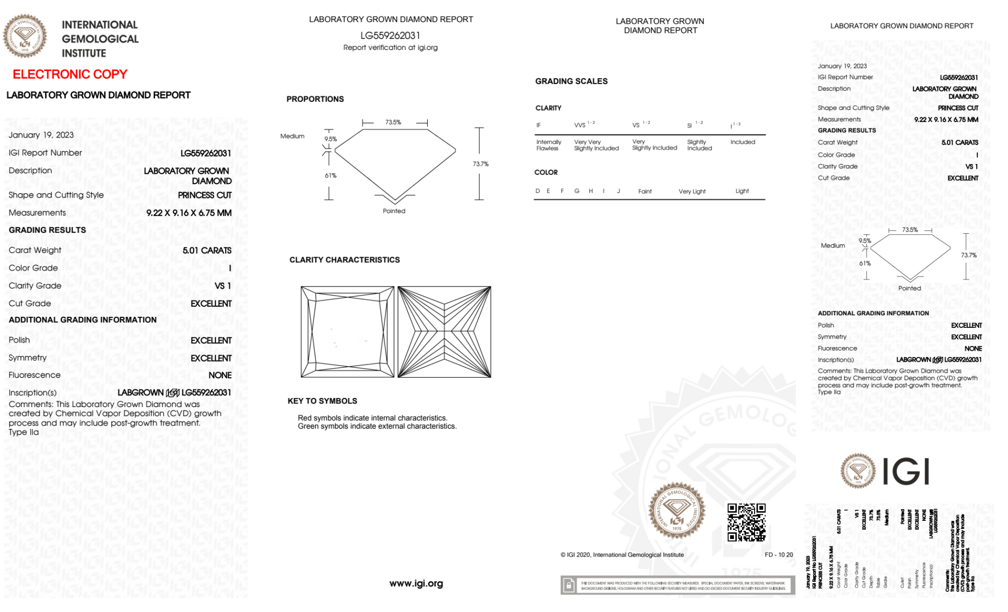 Your 5.01 carat Princess lab diamond is graded I color (Near Colorless), and you can read more about I color diamonds here.