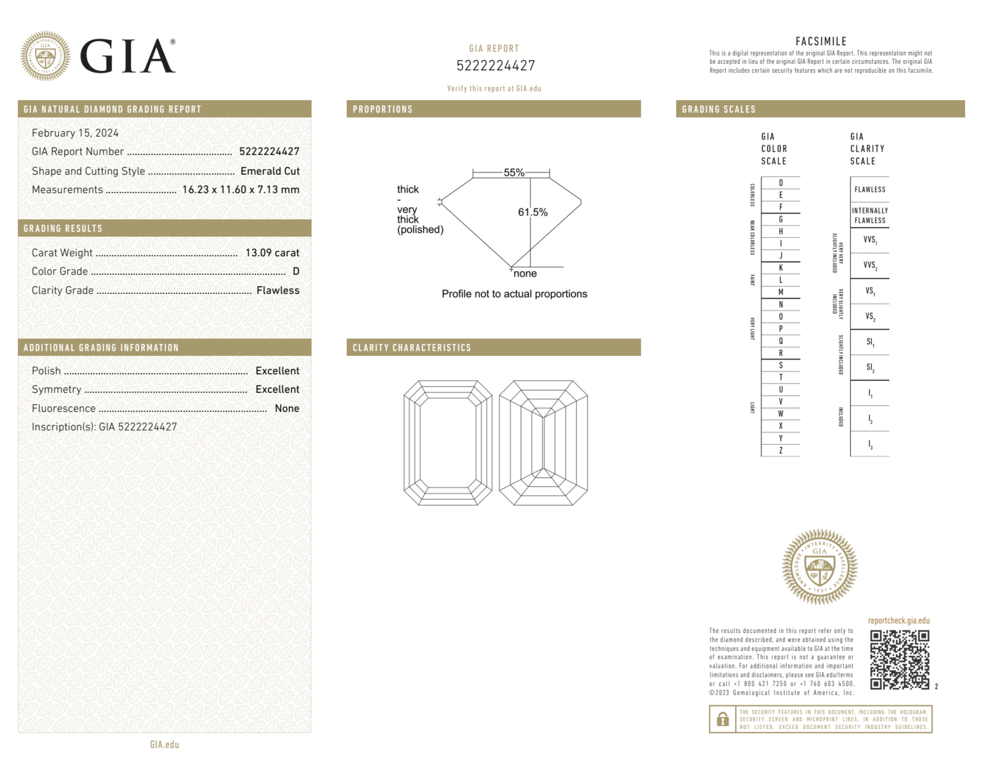 Your 13.09 carat Emerald natural diamond is graded FL clarity, which stands for Flawless. Read more about FL clarity diamonds here, or learn more about diamond clarity in general here.