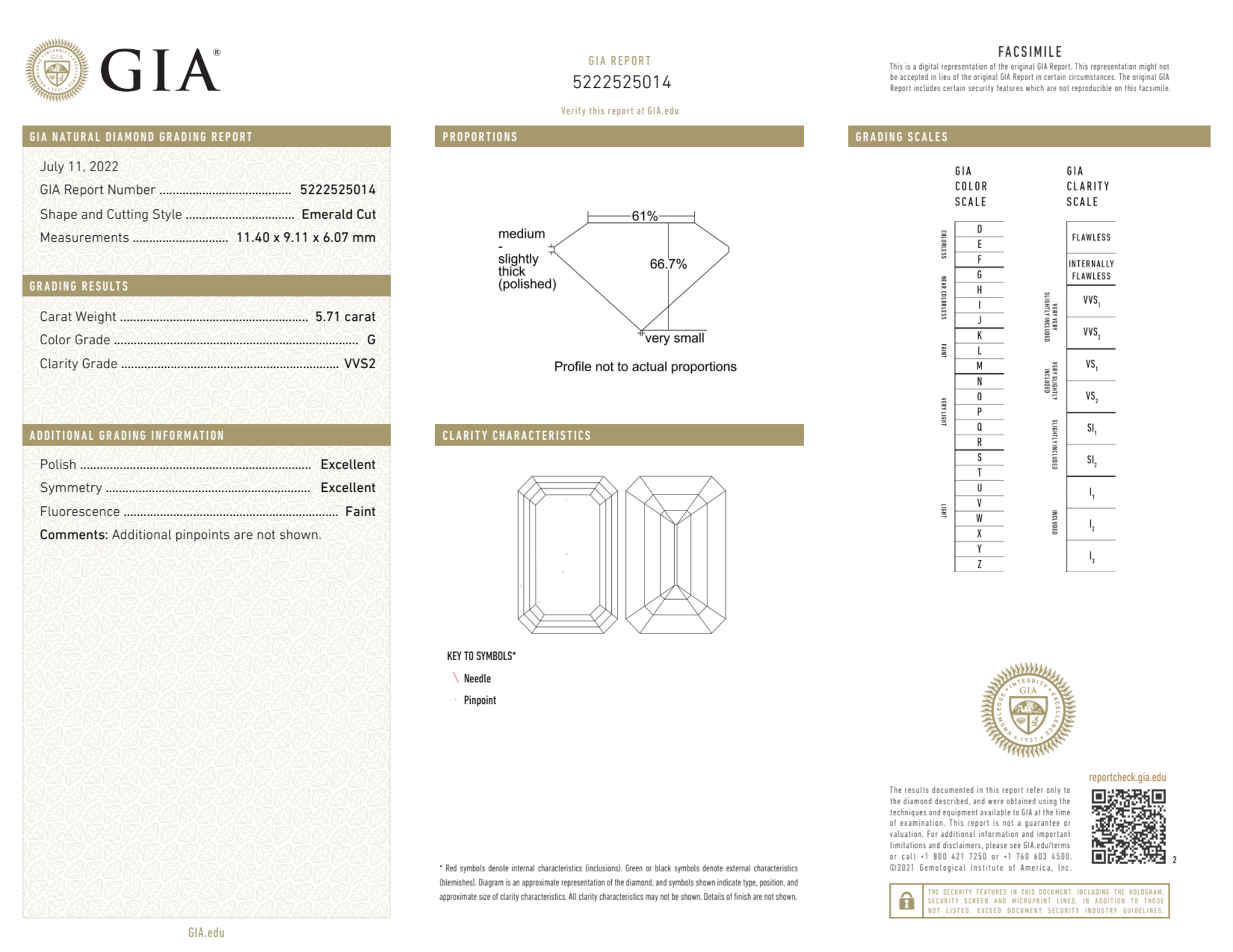 Your 5.71 carat Emerald natural diamond is graded VVS2 clarity, which stands for Very Very Slightly Included 2. Read more about VVS2 clarity diamonds here, or learn more about diamond clarity in general here.