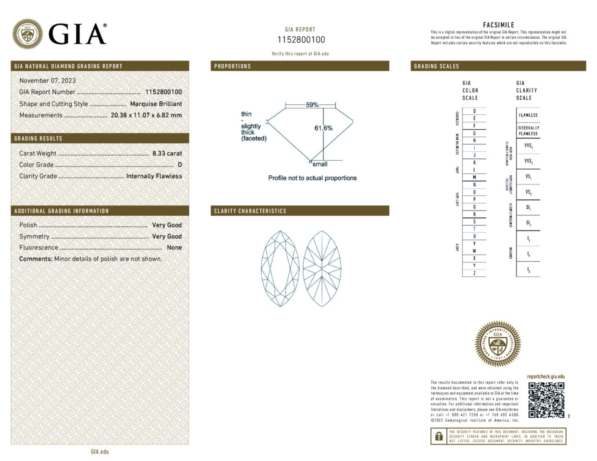 Your 8.33 carat Marquise natural diamond is graded IF clarity, which stands for Internally Flawless. Read more about IF clarity diamonds here, or learn more about diamond clarity in general here.