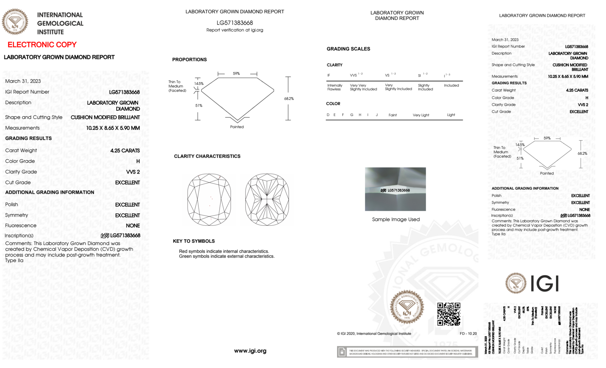 Your 4.25 carat Cushion lab diamond is graded H color (Near Colorless), and you can read more about H color diamonds here.