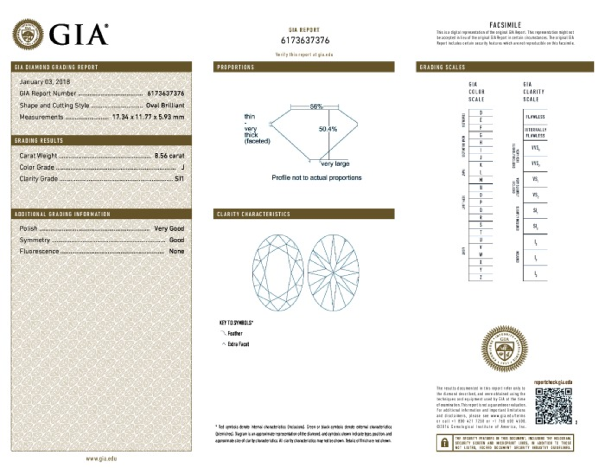 Your 8.56 carat Oval natural diamond is graded J color (Near Colorless), and you can read more about J color diamonds here.
