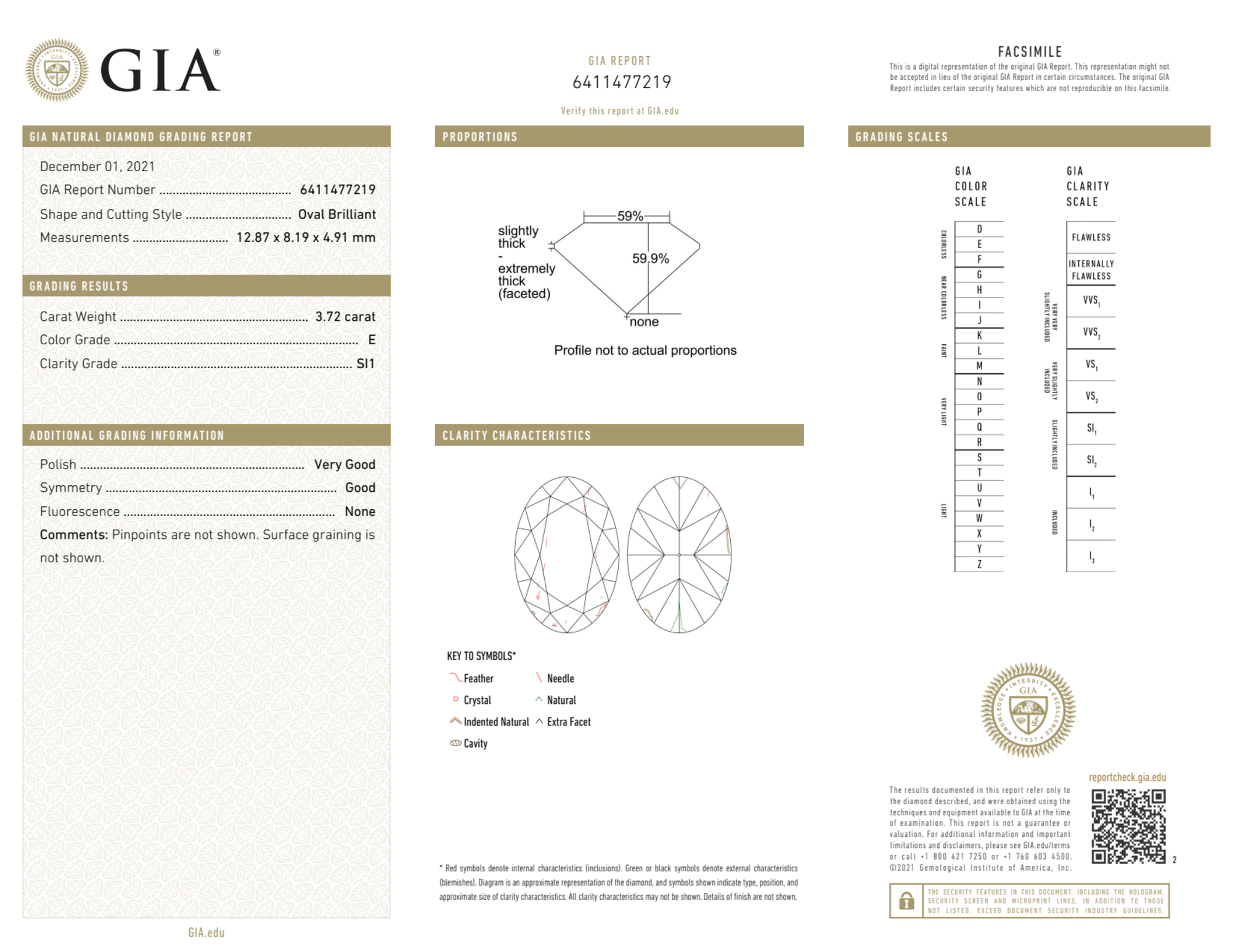 Your 3.72 carat Oval natural diamond is graded SI1 clarity, which stands for Slightly Included 1. Read more about SI1 clarity diamonds here, or learn more about diamond clarity in general here.