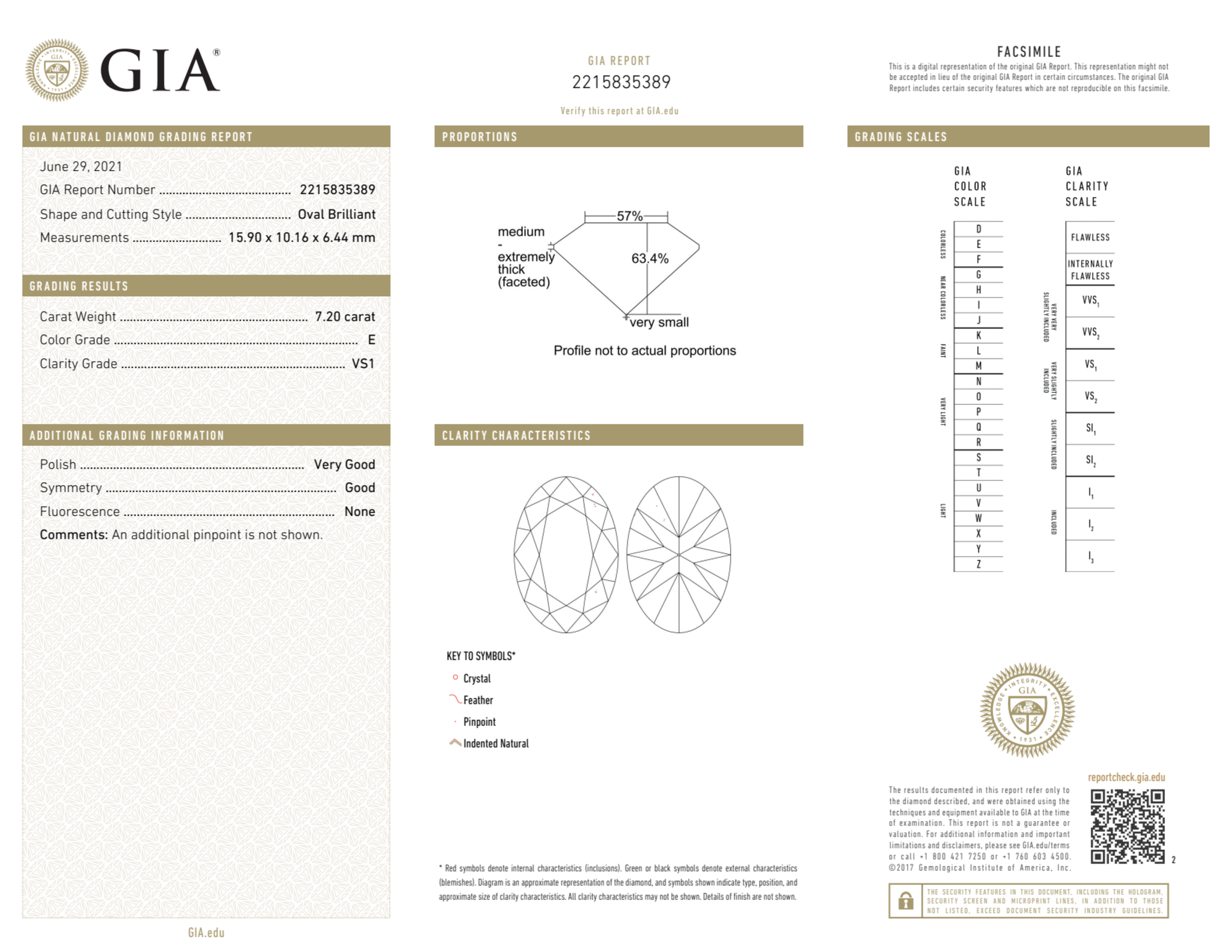 Your 7.20 carat Oval natural diamond is graded E color (Colorless), and you can read more about E color diamonds here.
