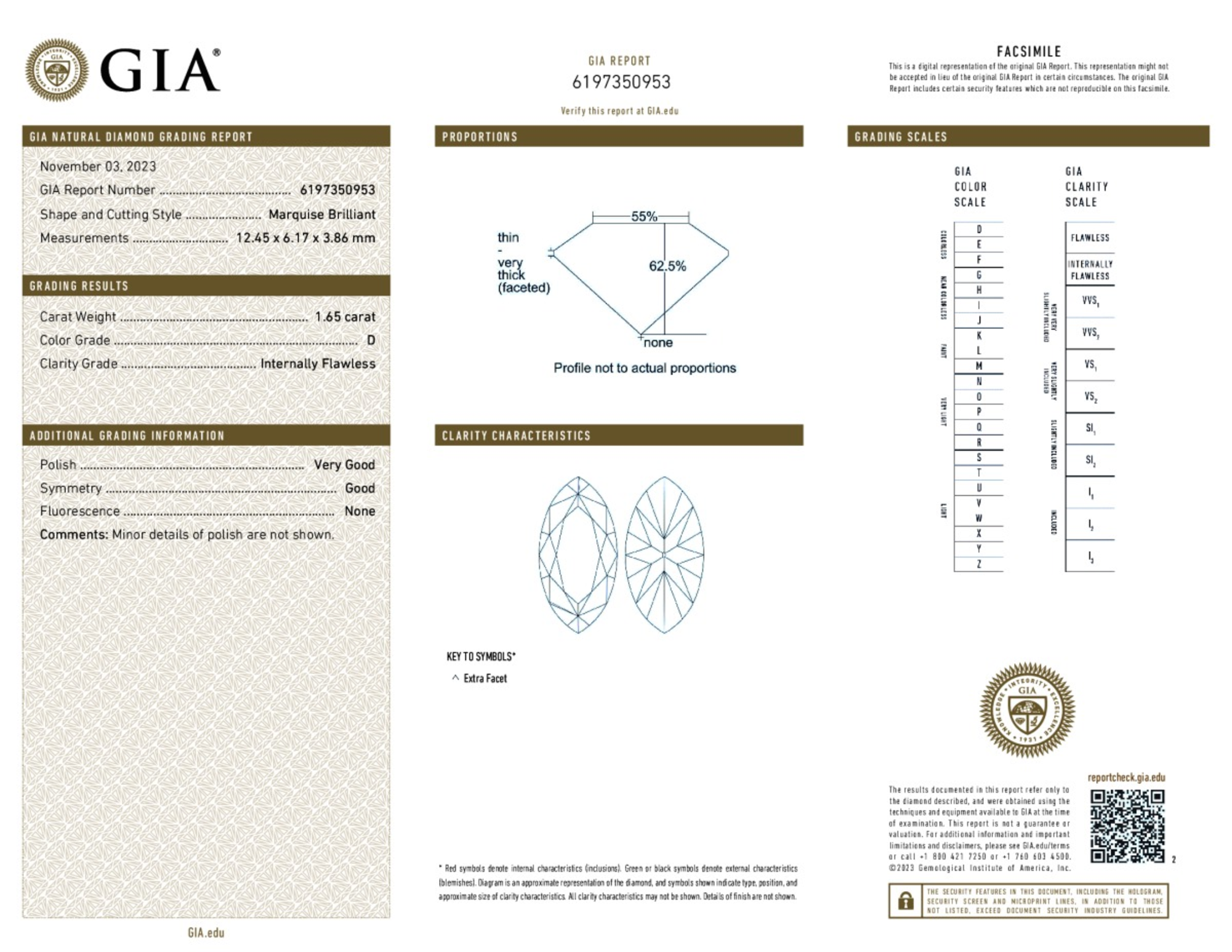 Your 1.65 carat Marquise natural diamond is graded IF clarity, which stands for Internally Flawless. Read more about IF clarity diamonds here, or learn more about diamond clarity in general here.