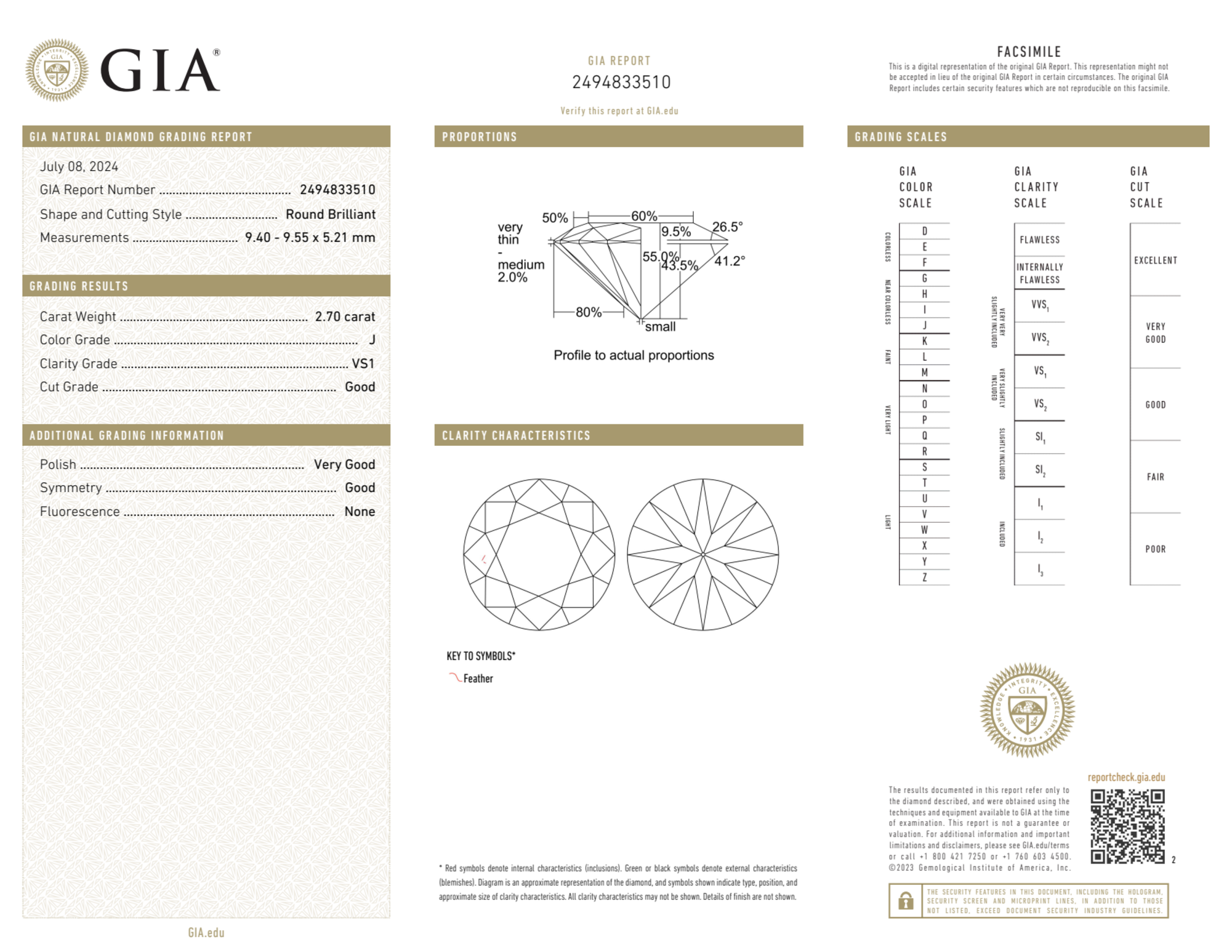 Your 2.70 carat Round natural diamond is graded J color (Near Colorless), and you can read more about J color diamonds here.