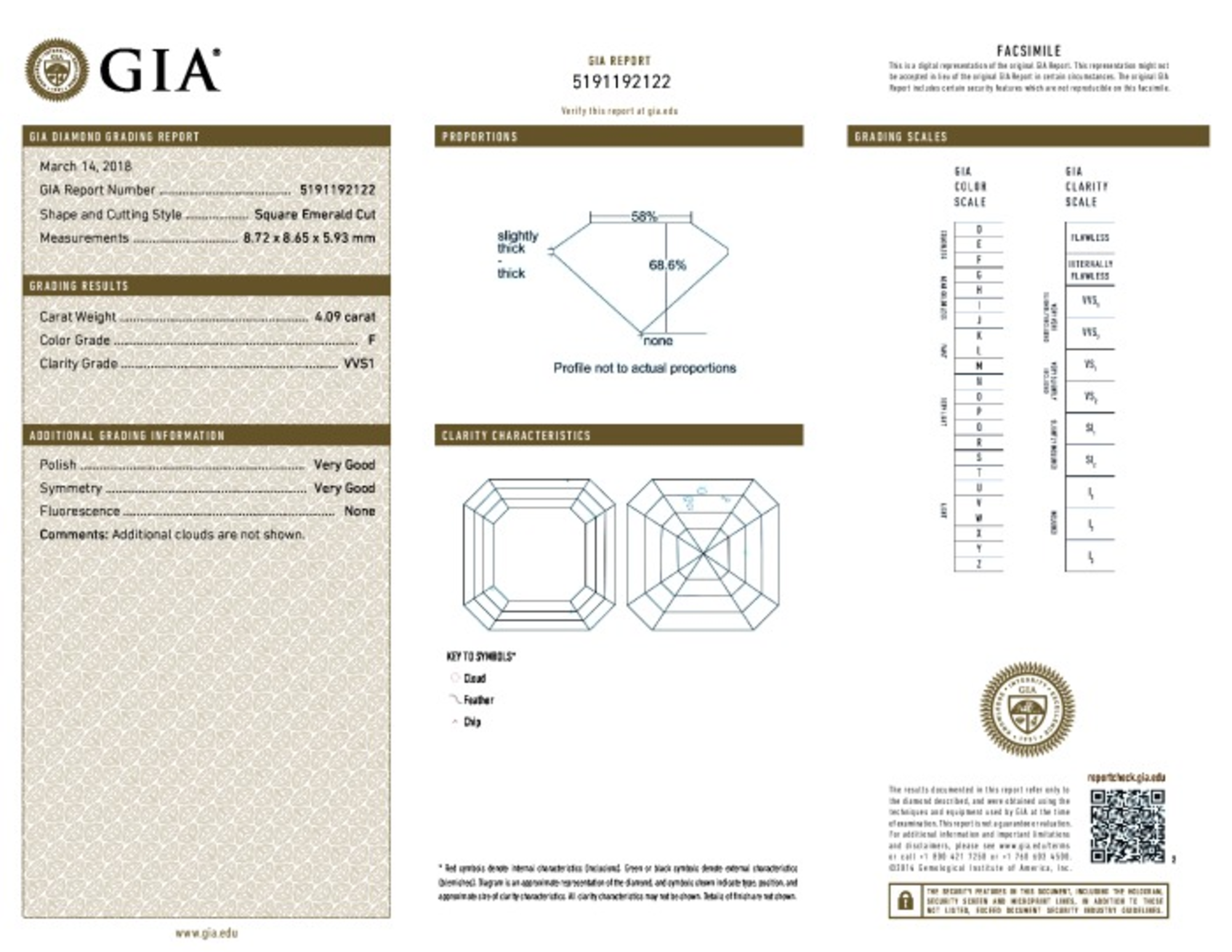Your 4.09 carat Asscher natural diamond is graded F color (Colorless), and you can read more about F color diamonds here.