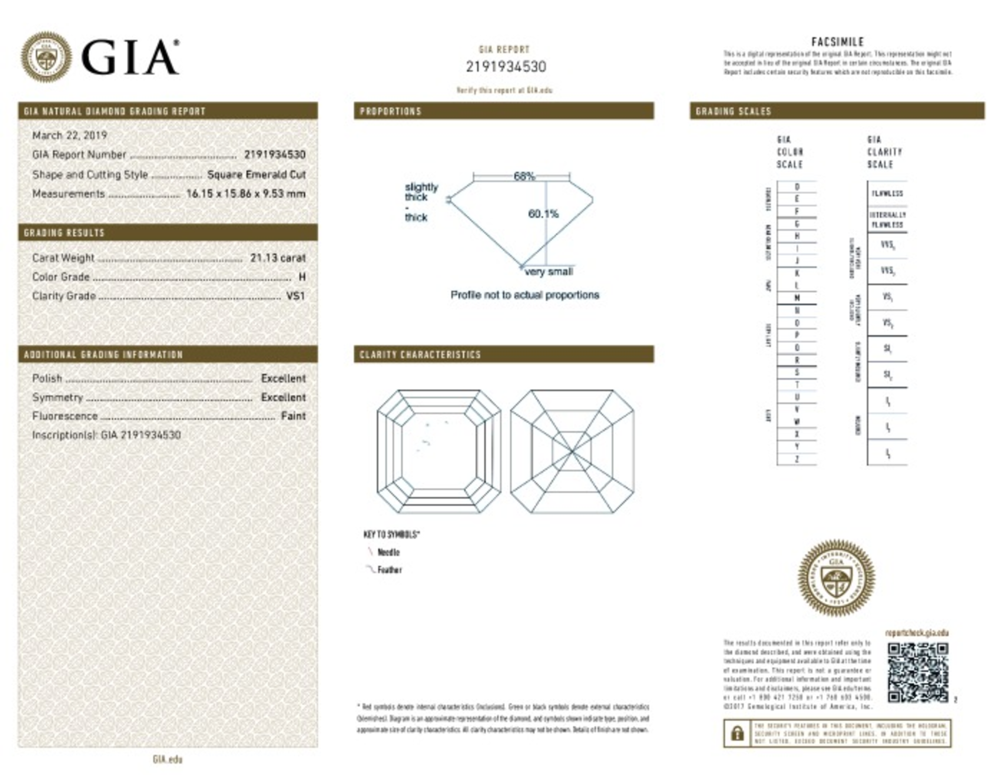 Your 21.13 carat Asscher natural diamond is graded H color (Near Colorless), and you can read more about H color diamonds here.