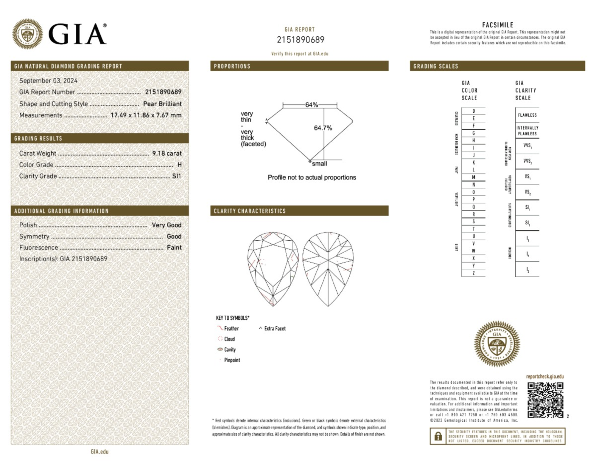 Your 9.18 carat Pear natural diamond is graded SI1 clarity, which stands for Slightly Included 1. Read more about SI1 clarity diamonds here, or learn more about diamond clarity in general here.