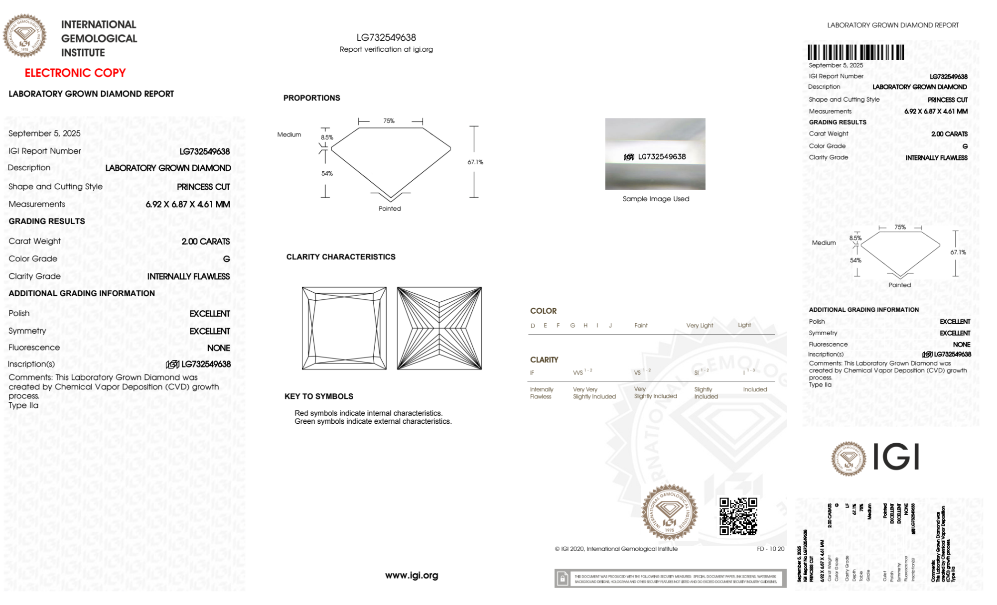 Your 2.00 carat Princess lab diamond is graded IF clarity, which stands for Internally Flawless. Read more about IF clarity diamonds here, or learn more about diamond clarity in general here.