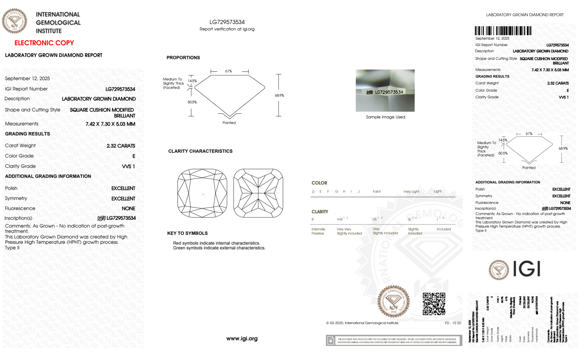 Your 2.32 carat Cushion lab diamond is graded E color (Colorless), and you can read more about E color diamonds here.