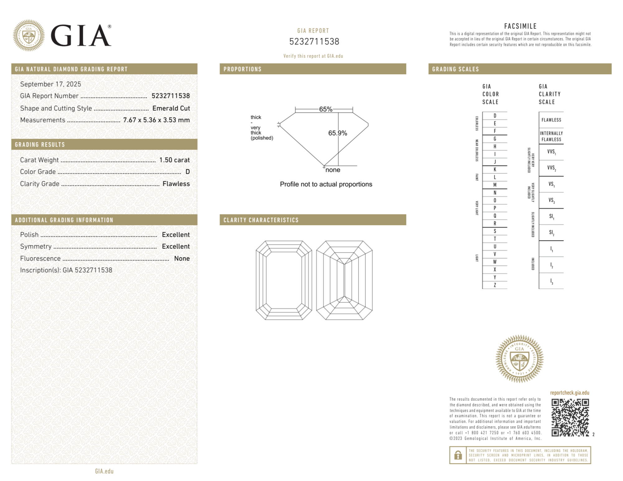 Your 1.50 carat Emerald natural diamond is graded FL clarity, which stands for Flawless. Read more about FL clarity diamonds here, or learn more about diamond clarity in general here.