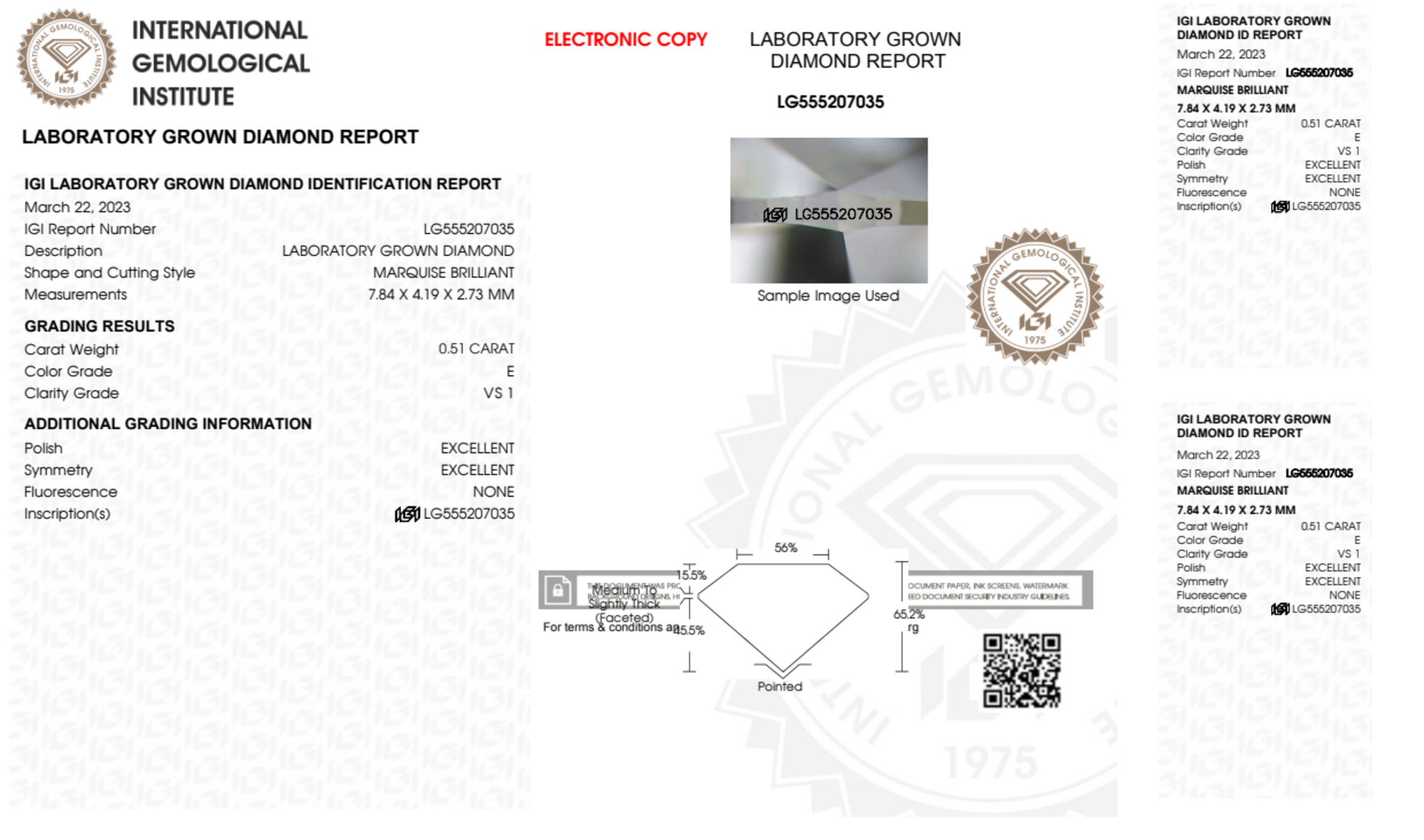 Your 0.51 carat Marquise lab diamond is graded E color (Colorless), and you can read more about E color diamonds here.
