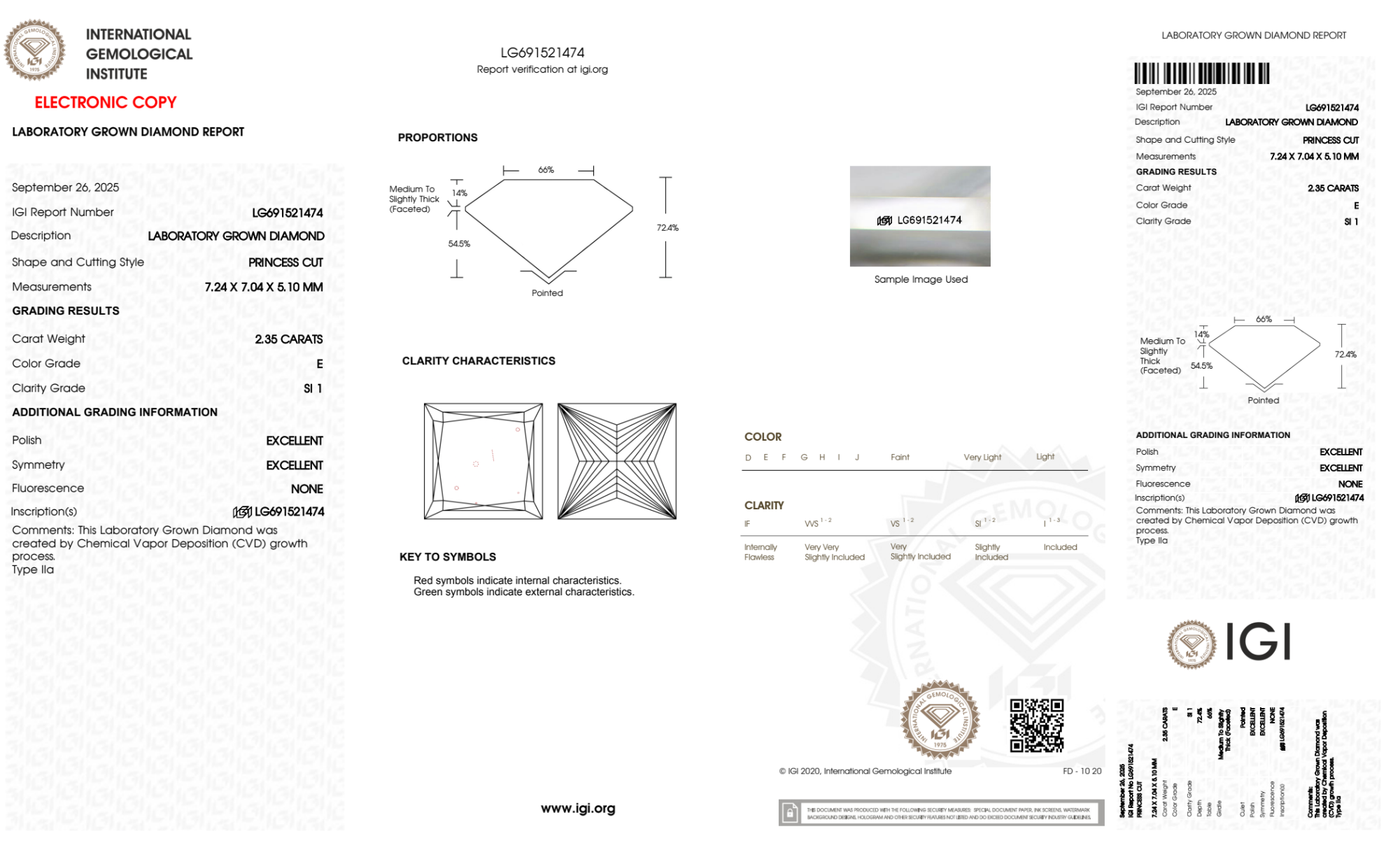 Your 2.35 carat Princess lab diamond is graded E color (Colorless), and you can read more about E color diamonds here.
