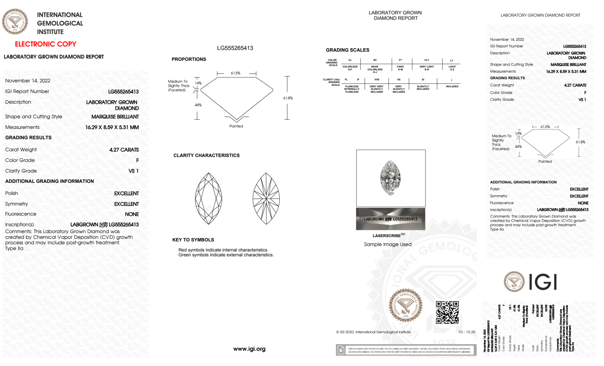 Your 4.27 carat Marquise lab diamond is graded F color (Colorless), and you can read more about F color diamonds here.