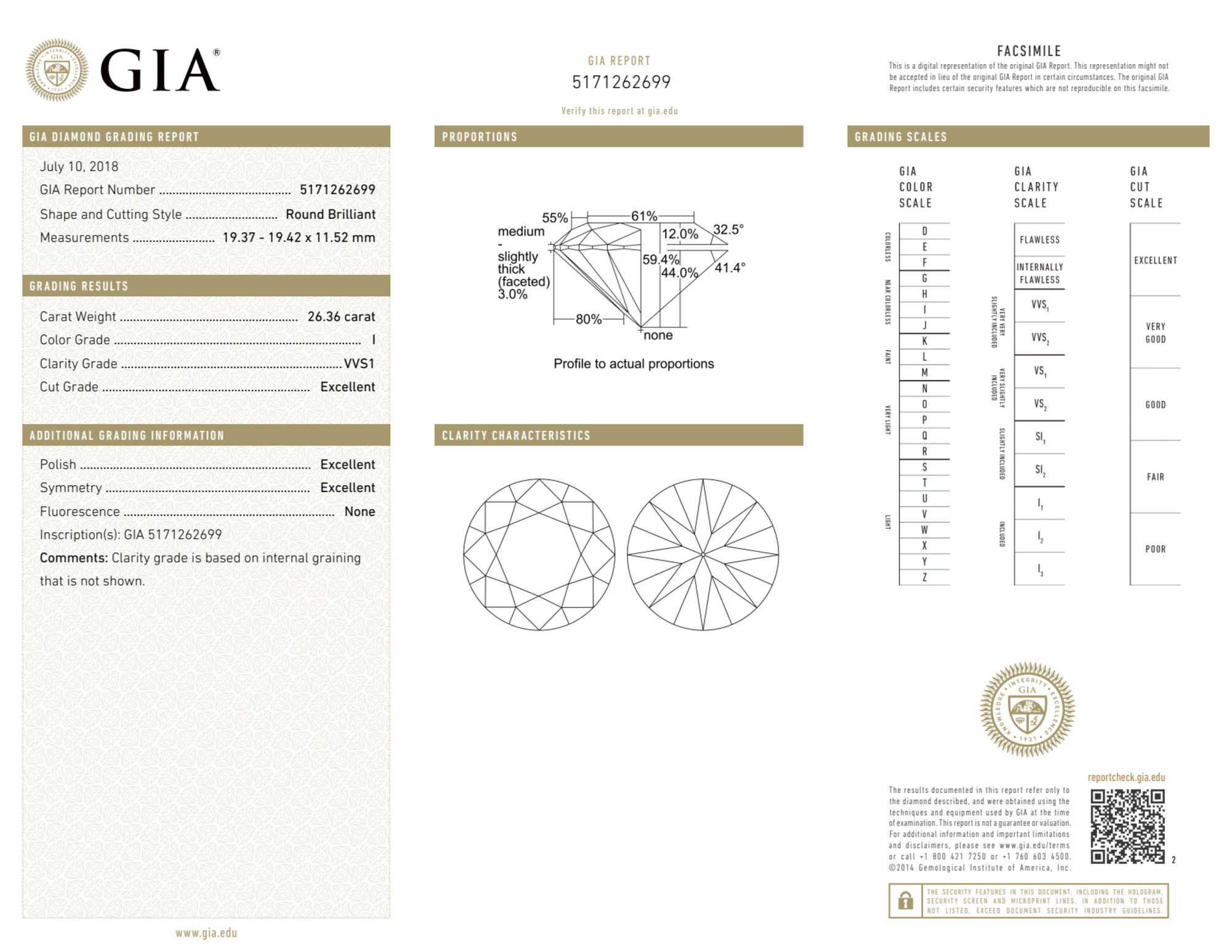 Your 26.36 carat Round natural diamond is graded VVS1 clarity, which stands for Very Very Slightly Included 1. Read more about VVS1 clarity diamonds here, or learn more about diamond clarity in general here.
