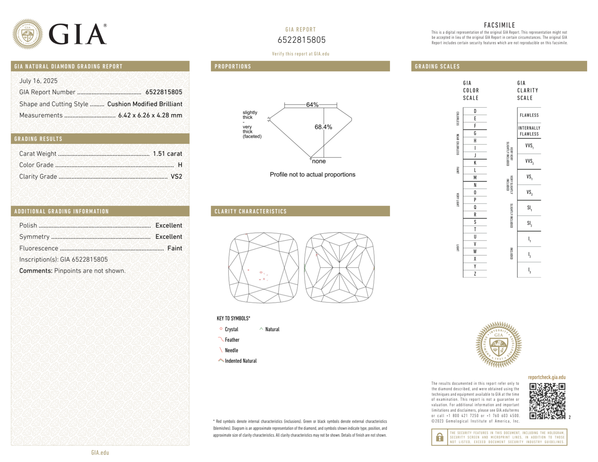 Your 1.51 carat Cushion natural diamond is graded H color (Near Colorless), and you can read more about H color diamonds here.