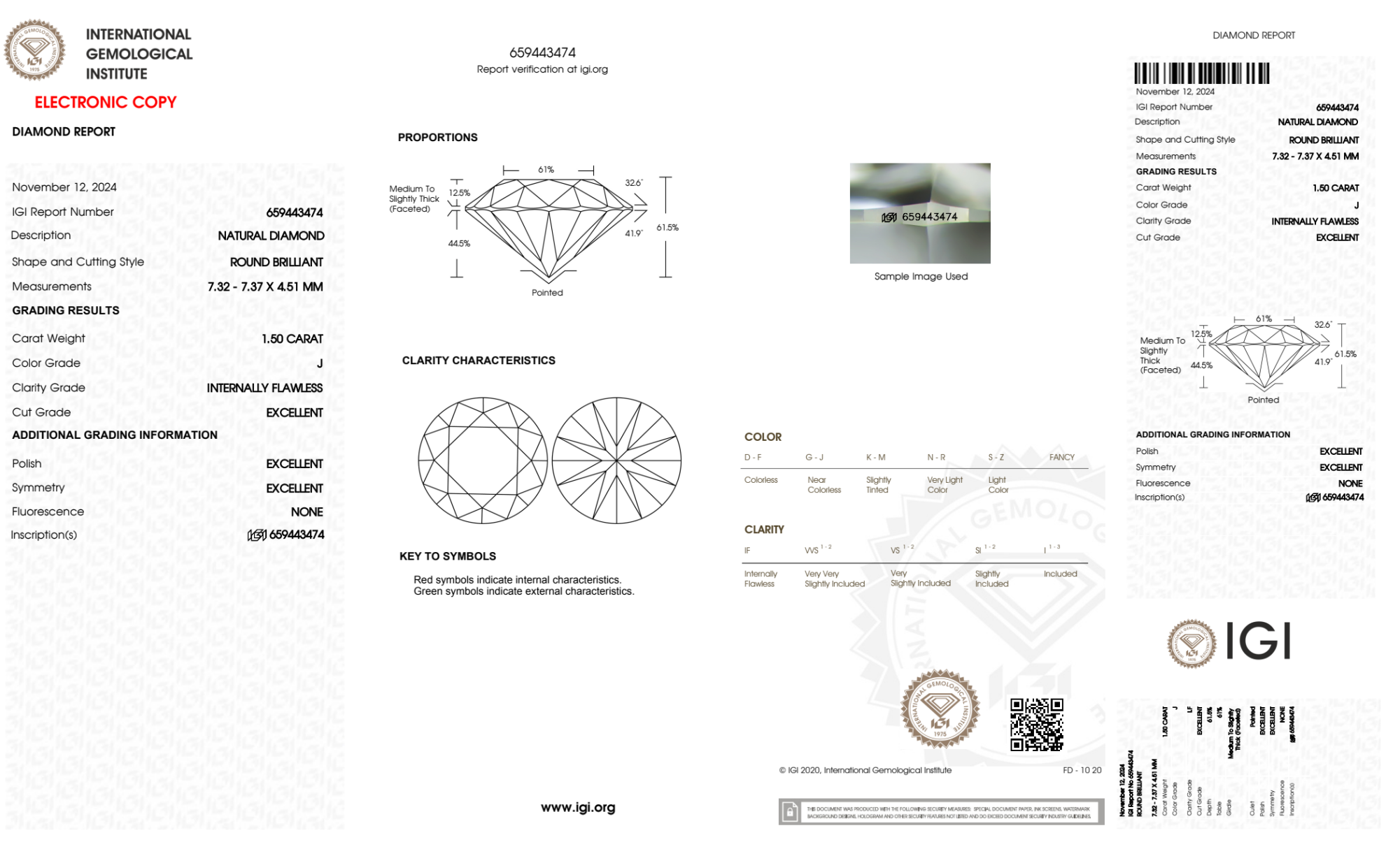 Your 1.50 carat Round natural diamond is graded IF clarity, which stands for Internally Flawless. Read more about IF clarity diamonds here, or learn more about diamond clarity in general here.