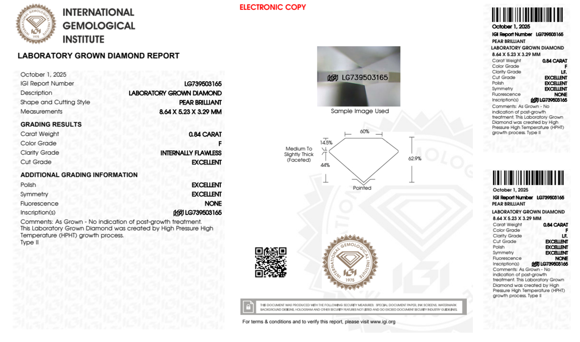 Your 0.84 carat Pear lab diamond is graded IF clarity, which stands for Internally Flawless. Read more about IF clarity diamonds here, or learn more about diamond clarity in general here.