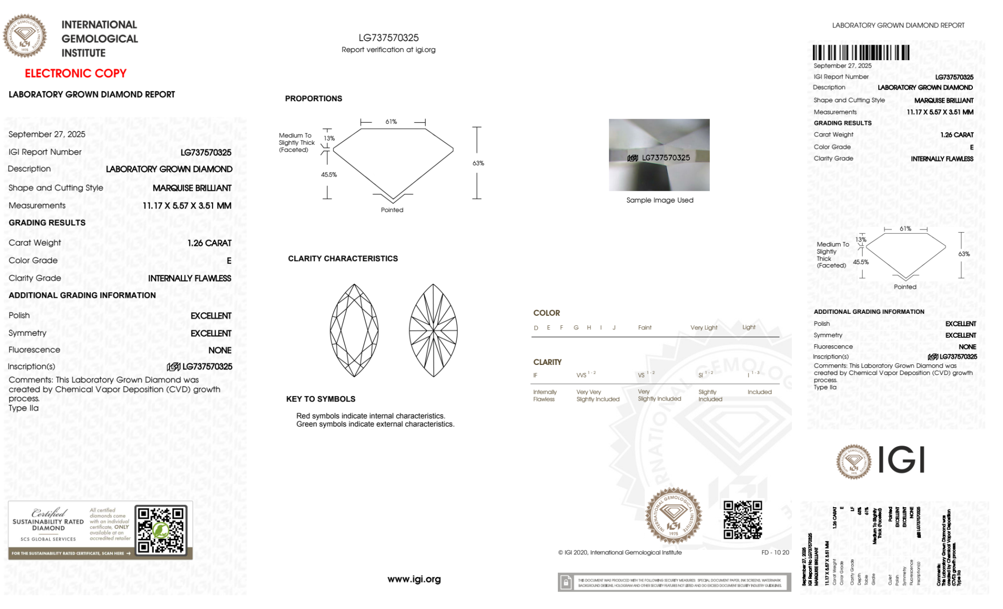 Your 1.26 carat Marquise lab diamond is graded E color (Colorless), and you can read more about E color diamonds here.