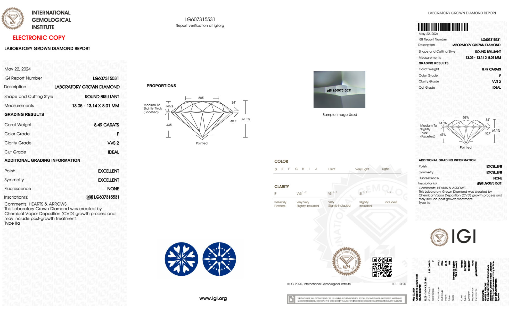 Your 8.49 carat Round lab diamond is graded F color (Colorless), and you can read more about F color diamonds here.