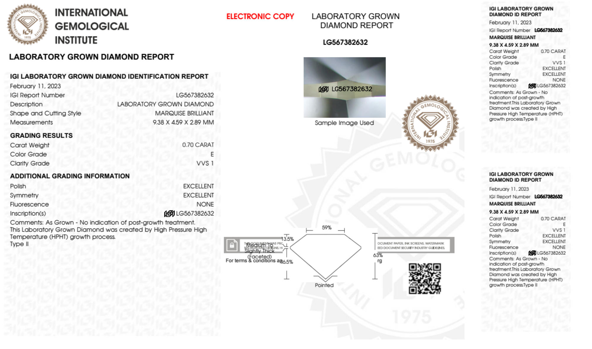 Your 0.70 carat Marquise lab diamond is graded E color (Colorless), and you can read more about E color diamonds here.