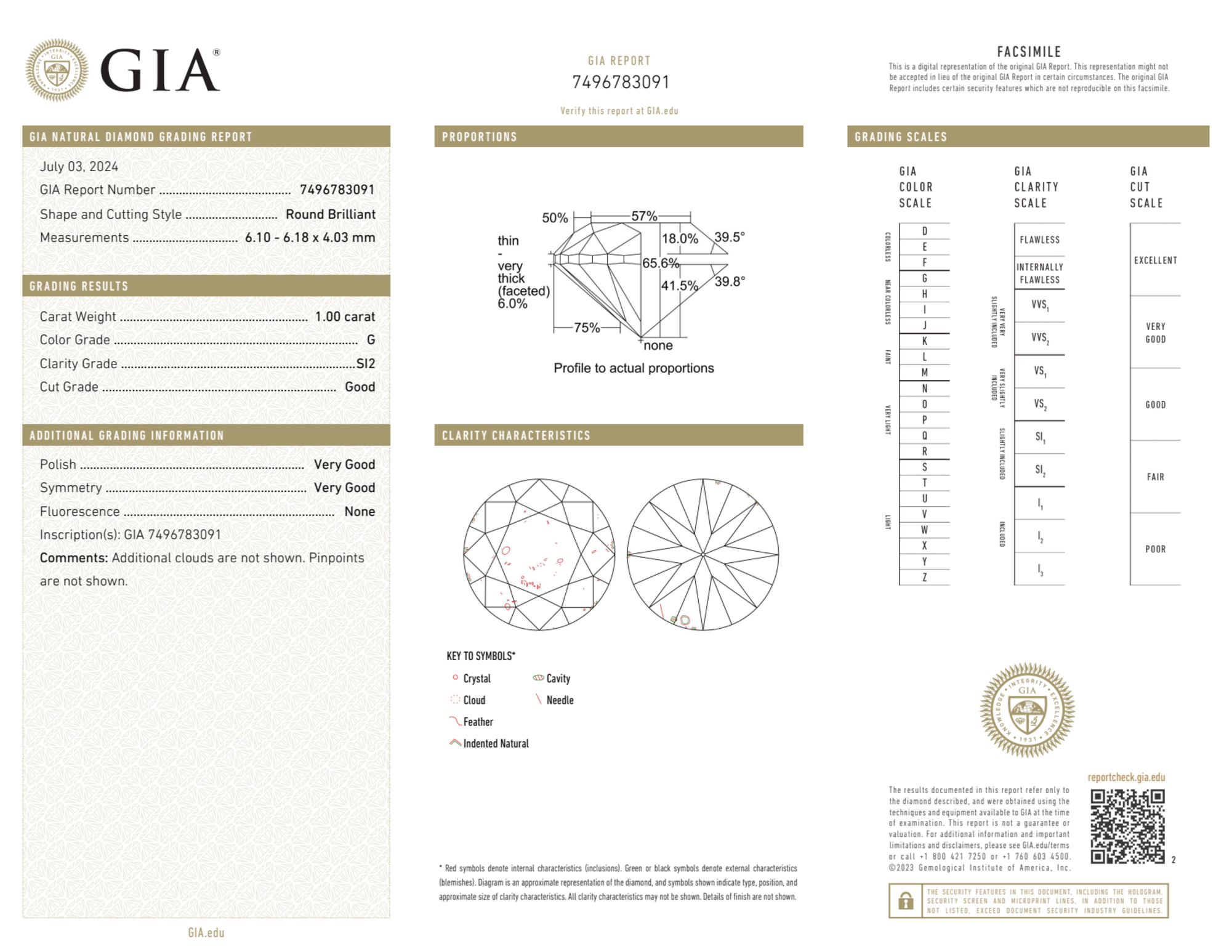 Your 1.00 carat Round natural diamond is graded SI2 clarity, which stands for Slightly Included 2. Read more about SI2 clarity diamonds here, or learn more about diamond clarity in general here.