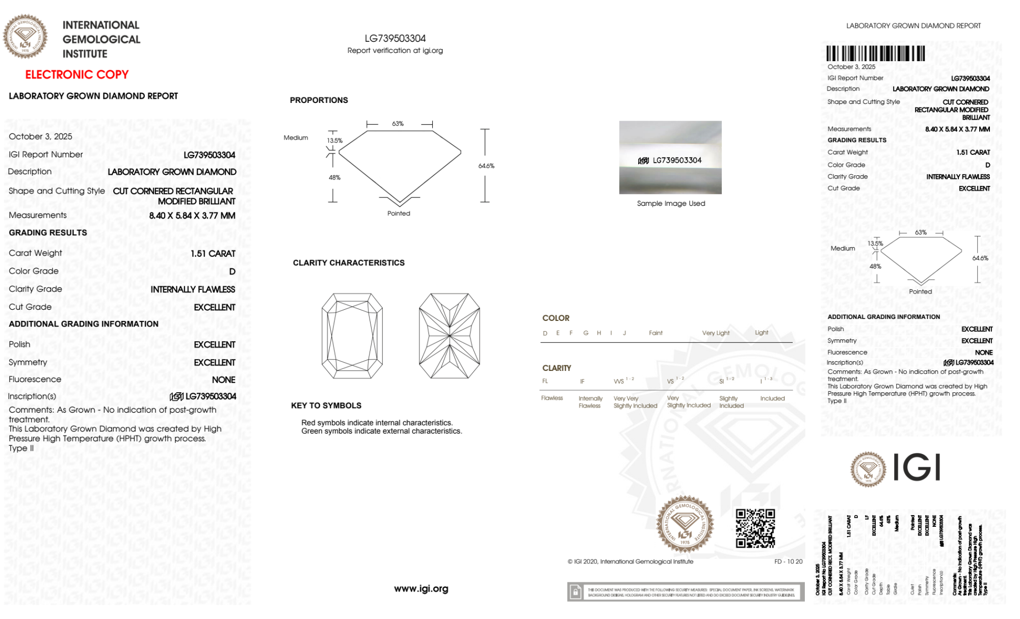 Your 1.51 carat Radiant lab diamond is graded IF clarity, which stands for Internally Flawless. Read more about IF clarity diamonds here, or learn more about diamond clarity in general here.