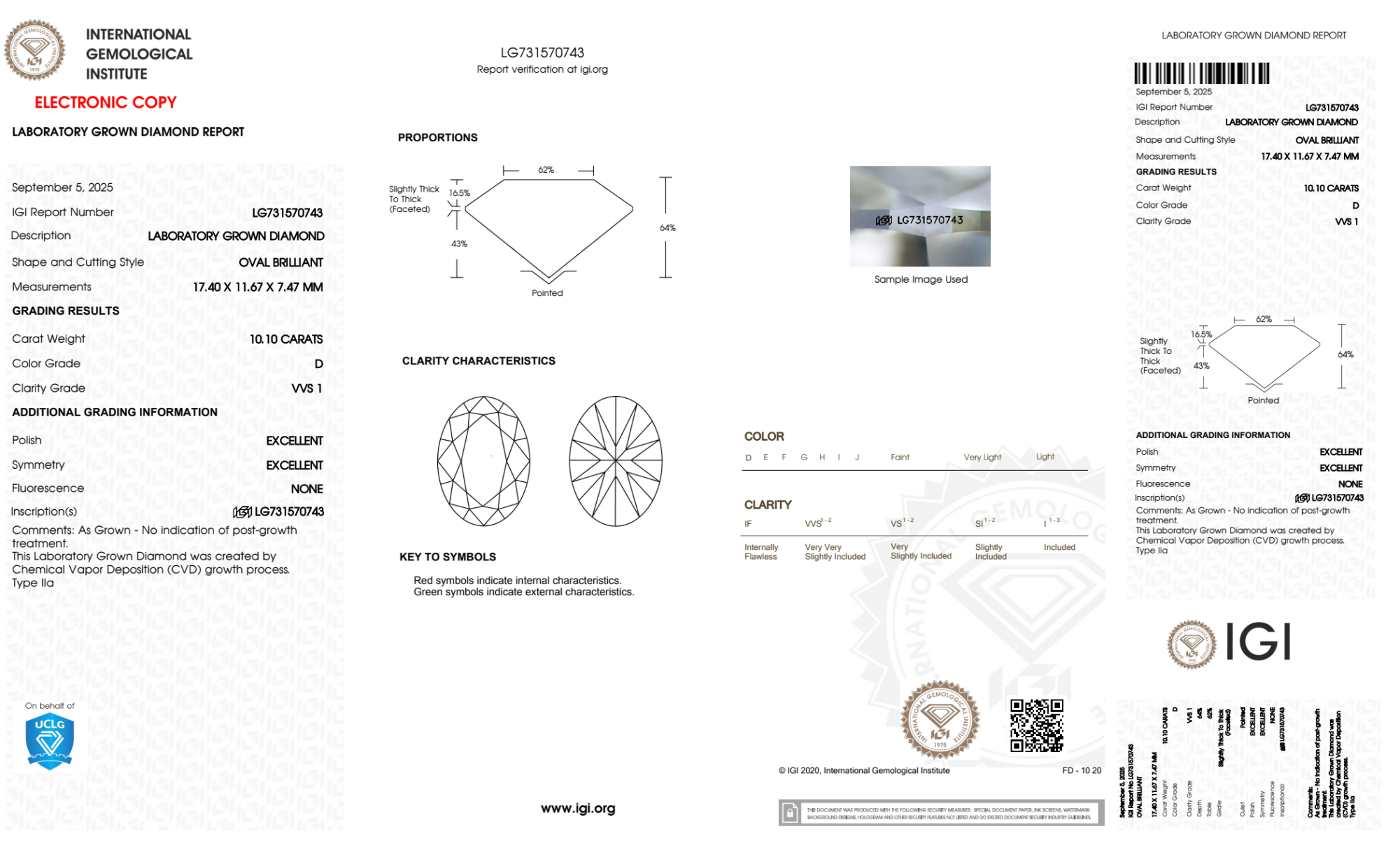 Your 10.10 carat Oval lab diamond is graded VVS1 clarity, which stands for Very Very Slightly Included 1. Read more about VVS1 clarity diamonds here, or learn more about diamond clarity in general here.