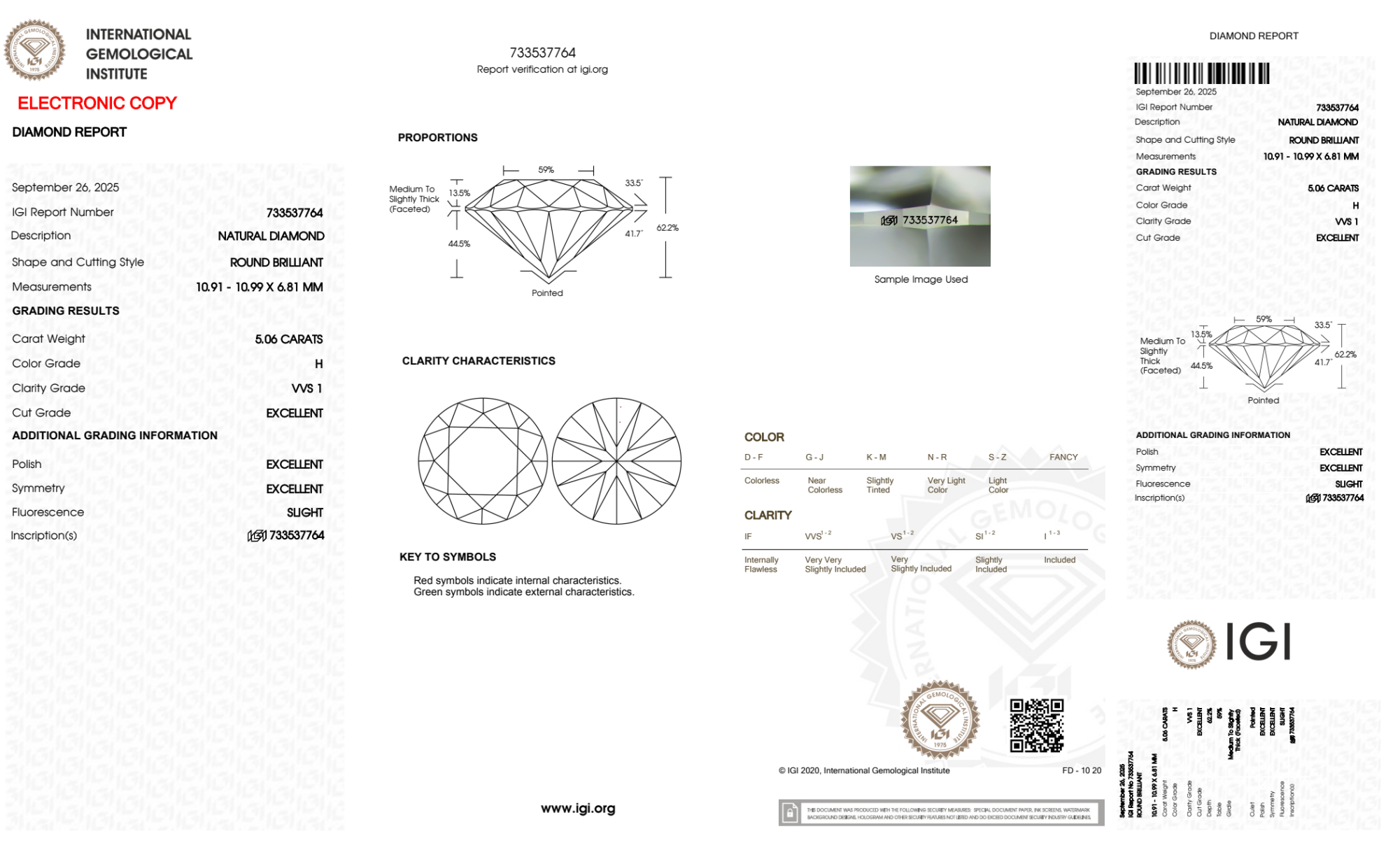 Your 5.06 carat Round natural diamond is graded VVS1 clarity, which stands for Very Very Slightly Included 1. Read more about VVS1 clarity diamonds here, or learn more about diamond clarity in general here.