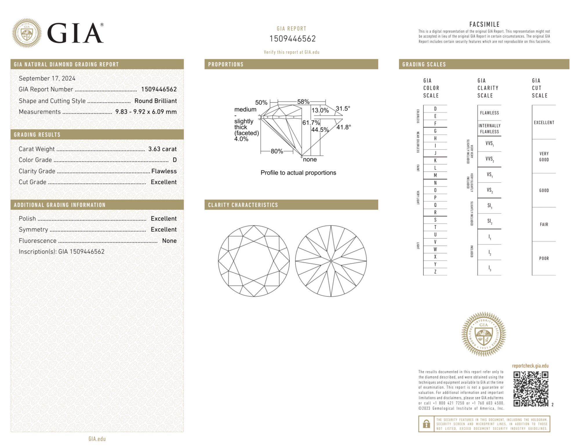 Your 3.63 carat Round natural diamond is graded FL clarity, which stands for Flawless. Read more about FL clarity diamonds here, or learn more about diamond clarity in general here.