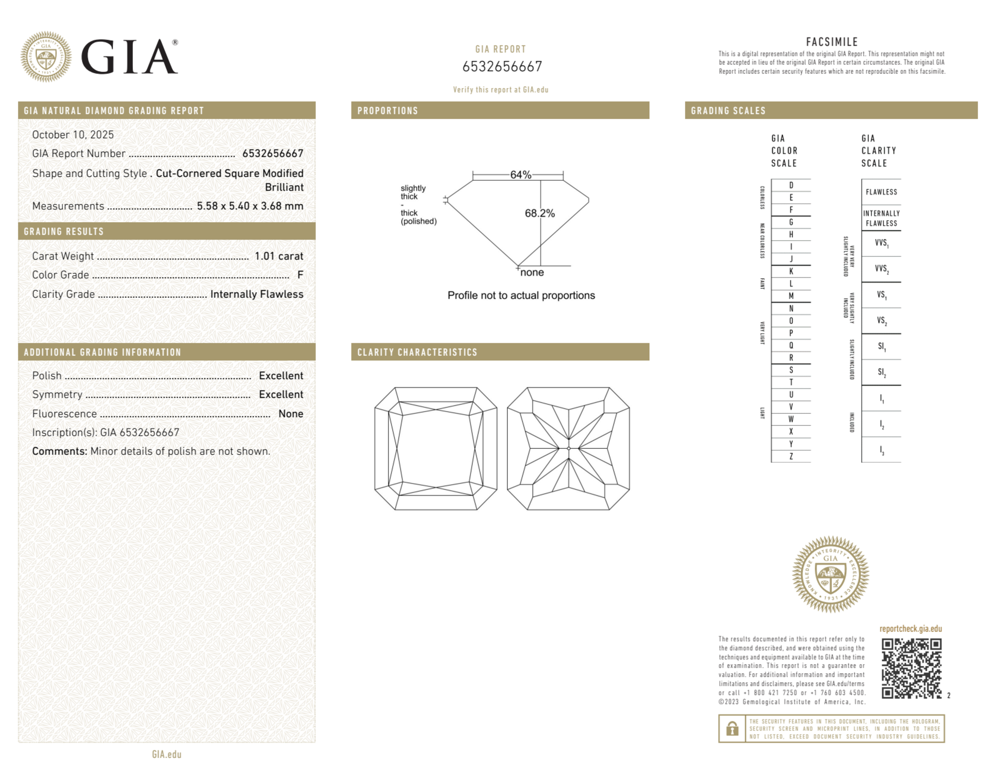 Your 1.01 carat Radiant natural diamond is graded F color (Colorless), and you can read more about F color diamonds here.