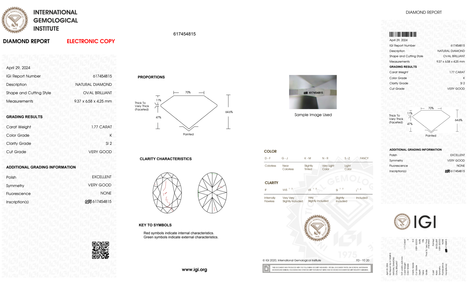 Your 1.77 carat Oval natural diamond is graded SI2 clarity, which stands for Slightly Included 2. Read more about SI2 clarity diamonds here, or learn more about diamond clarity in general here.
