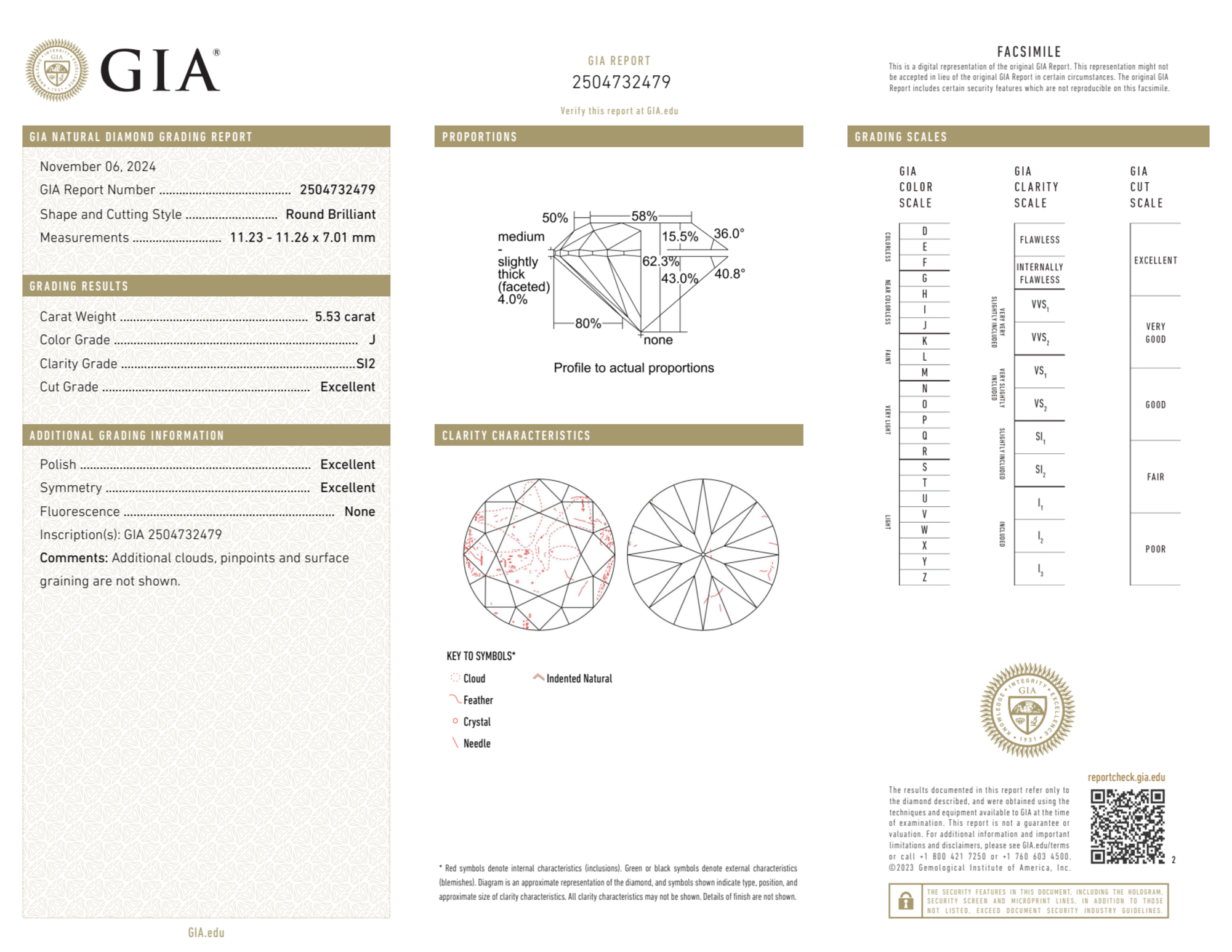Your 5.53 carat Round natural diamond is graded J color (Near Colorless), and you can read more about J color diamonds here.