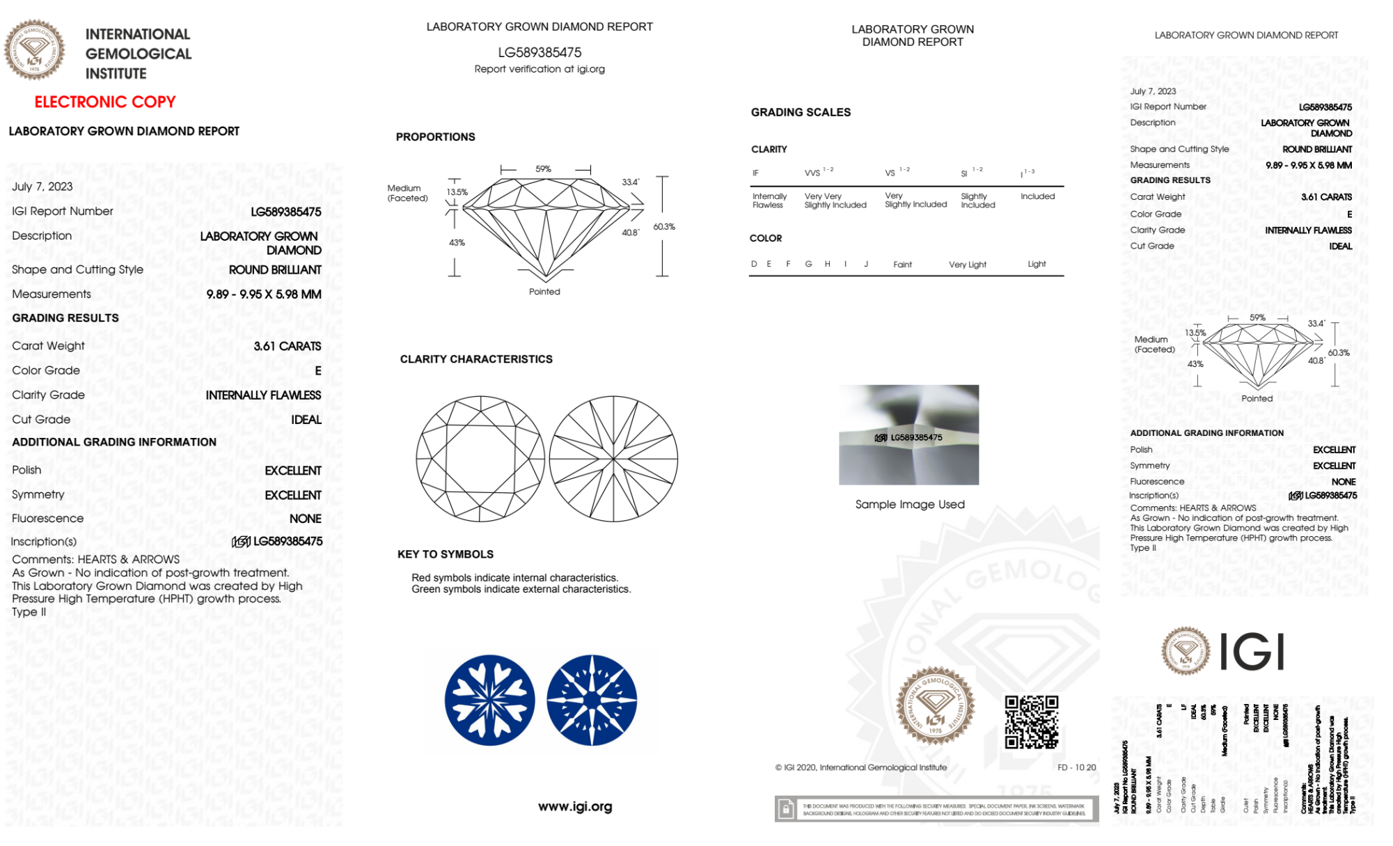 Your 3.61 carat Round lab diamond is graded IF clarity, which stands for Internally Flawless. Read more about IF clarity diamonds here, or learn more about diamond clarity in general here.