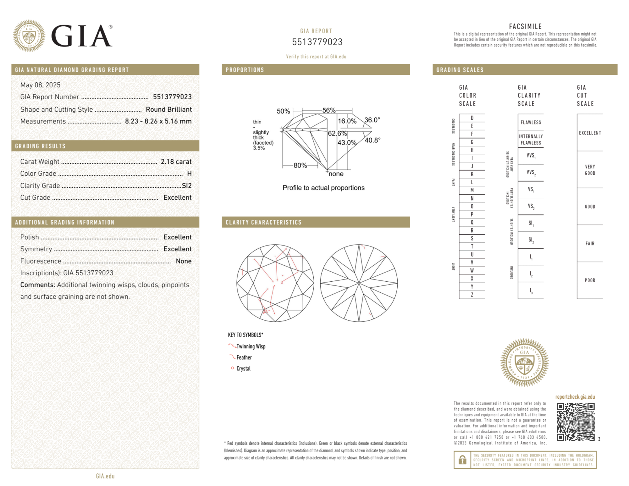 Your 2.18 carat Round natural diamond is graded H color (Near Colorless), and you can read more about H color diamonds here.