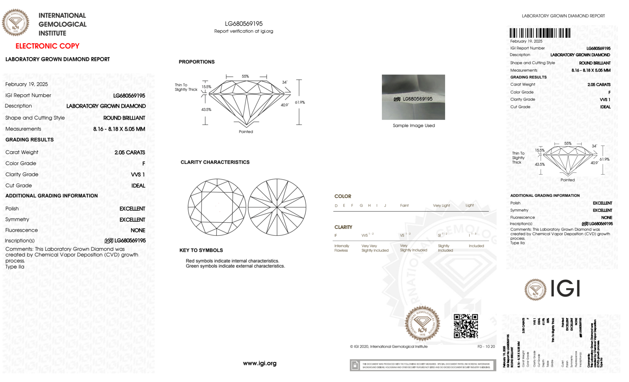 Your 2.05 carat Round lab diamond is graded VVS1 clarity, which stands for Very Very Slightly Included 1. Read more about VVS1 clarity diamonds here, or learn more about diamond clarity in general here.