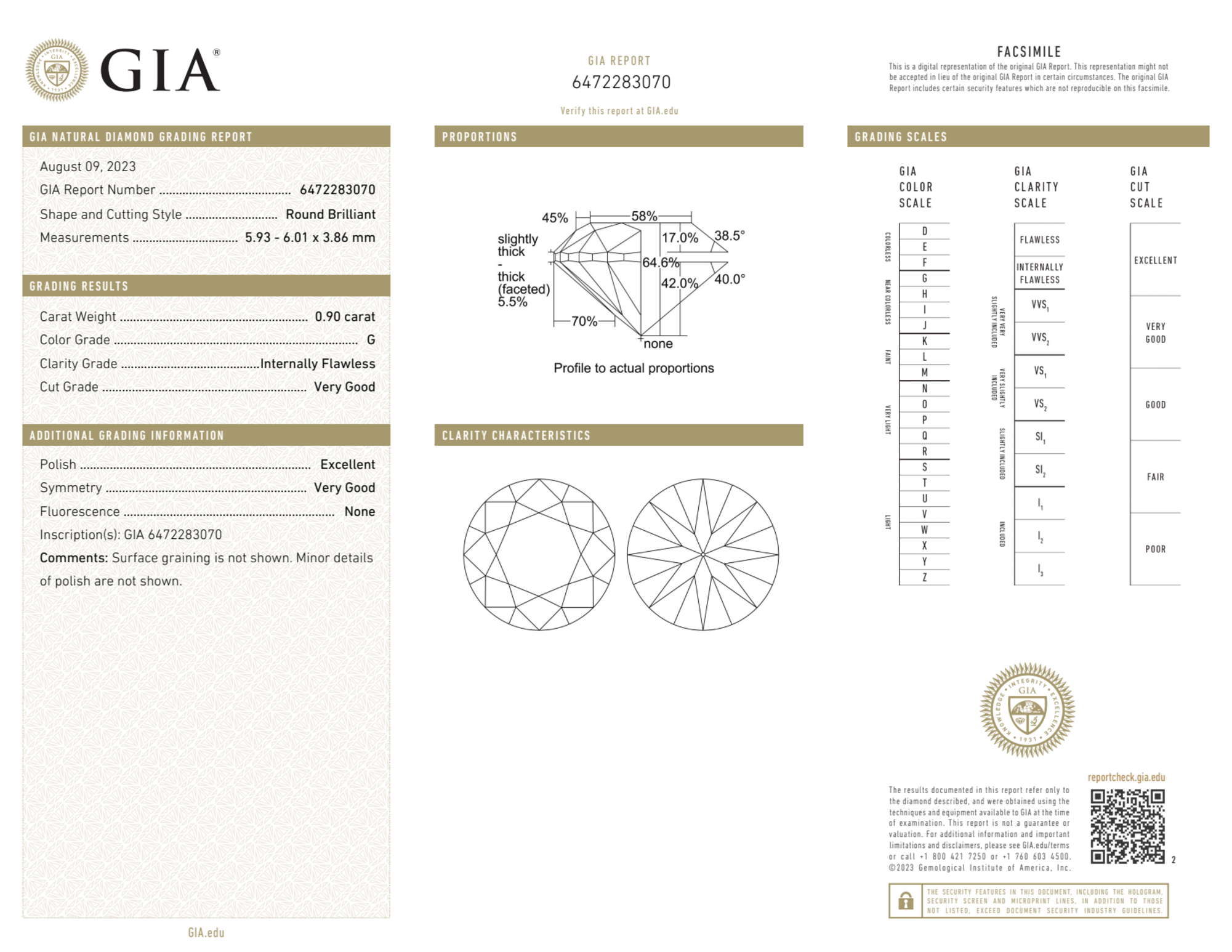 Your 0.90 carat Round natural diamond is graded IF clarity, which stands for Internally Flawless. Read more about IF clarity diamonds here, or learn more about diamond clarity in general here.