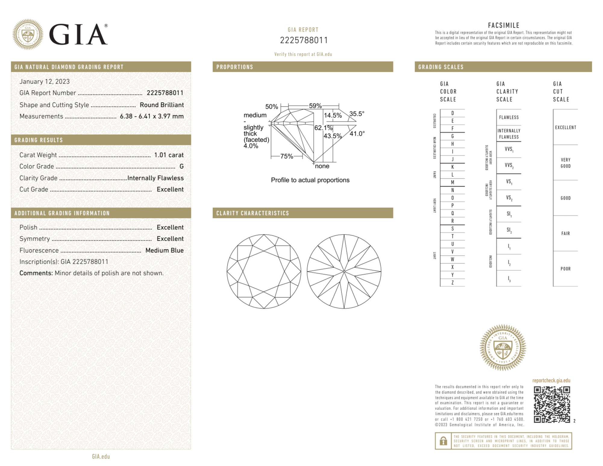 Your 1.01 carat Round natural diamond is graded G color (Near Colorless), and you can read more about G color diamonds here.