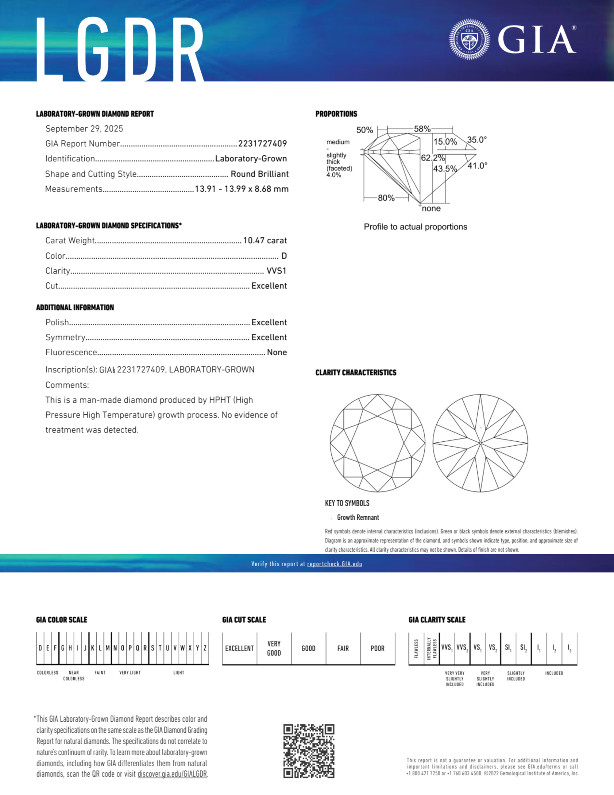 Your 10.47 carat Round lab diamond is graded D color (Colorless), and you can read more about D color diamonds here.