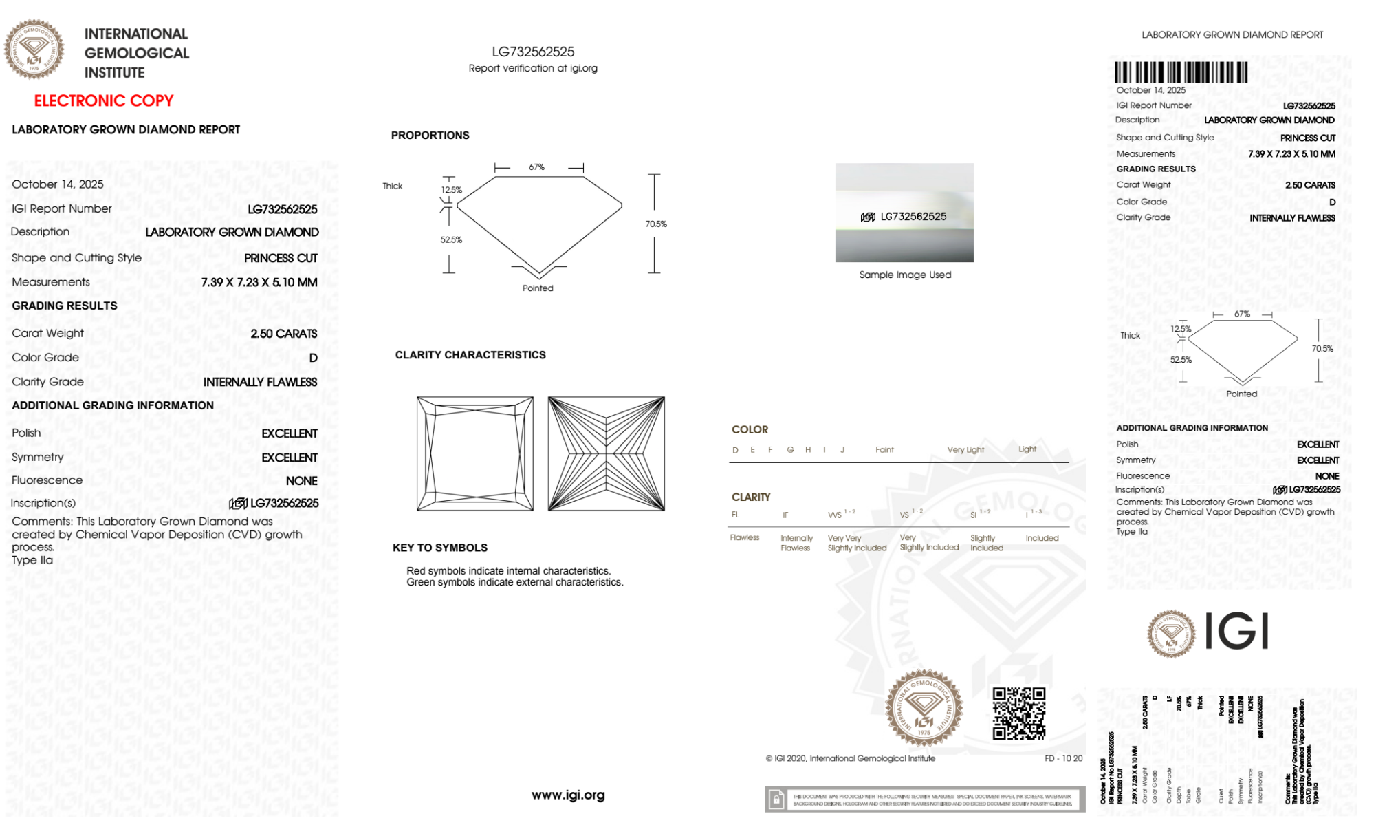 Your 2.50 carat Princess lab diamond is graded IF clarity, which stands for Internally Flawless. Read more about IF clarity diamonds here, or learn more about diamond clarity in general here.