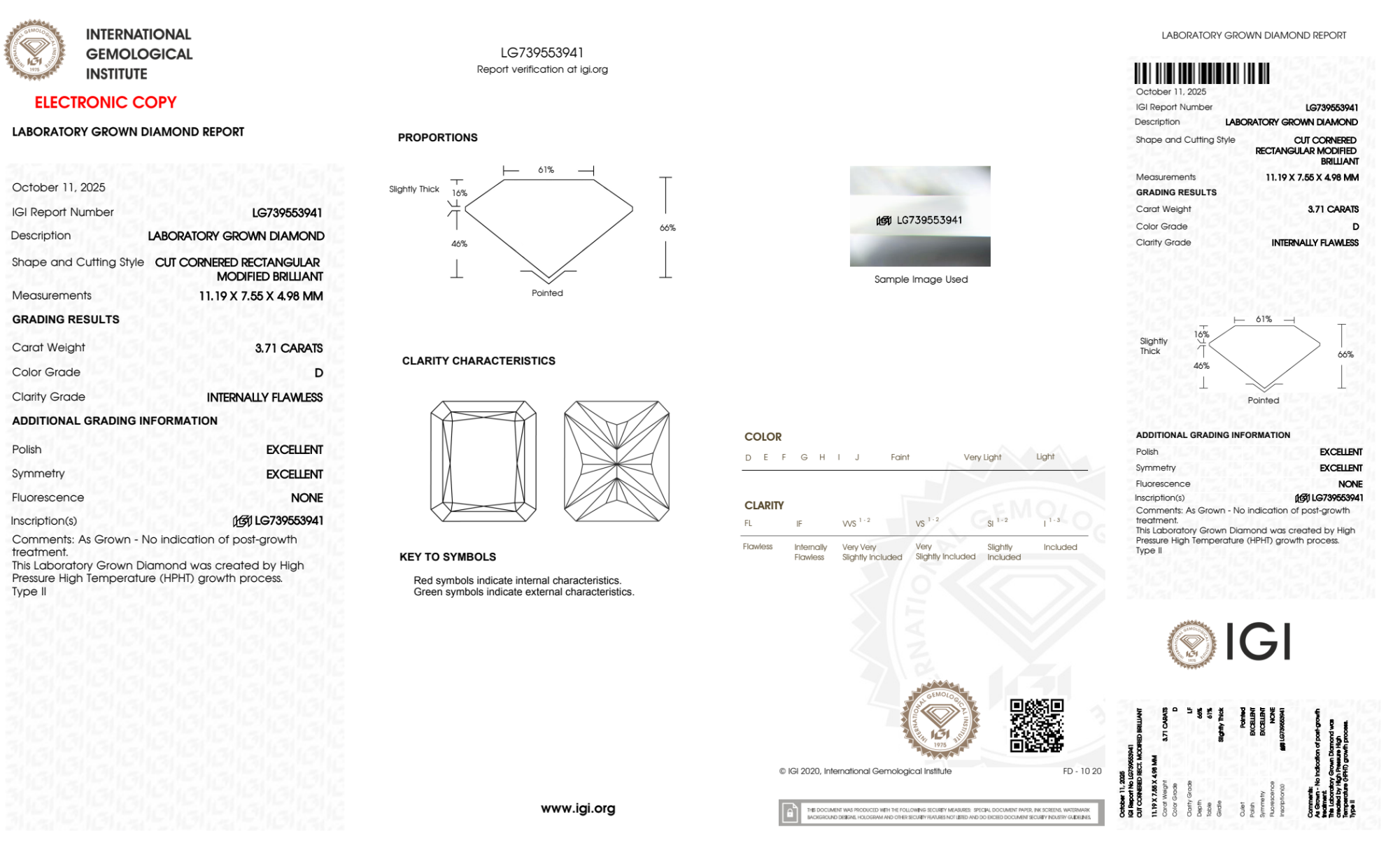 Your 3.71 carat Radiant lab diamond is graded IF clarity, which stands for Internally Flawless. Read more about IF clarity diamonds here, or learn more about diamond clarity in general here.