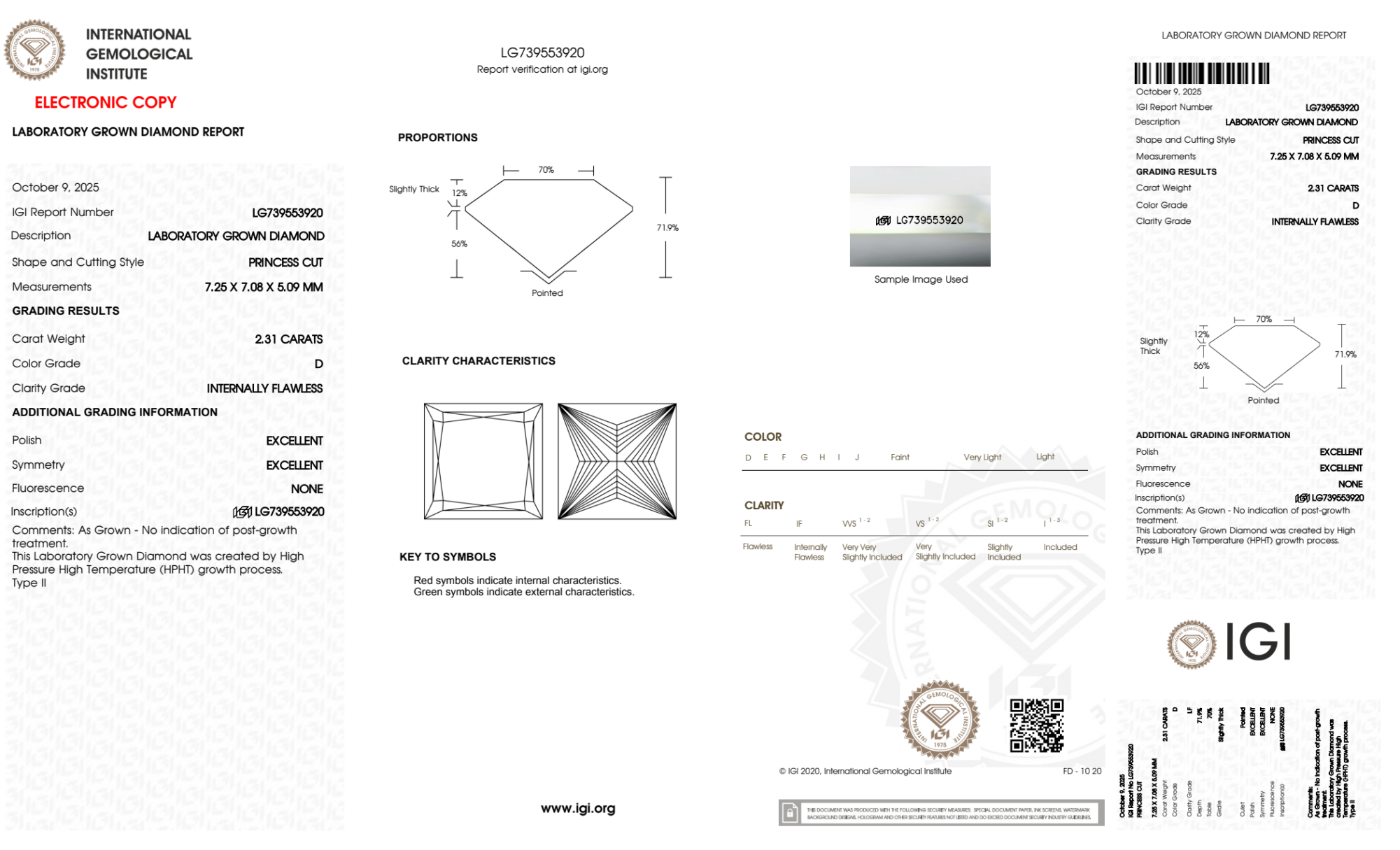 Your 2.31 carat Princess lab diamond is graded IF clarity, which stands for Internally Flawless. Read more about IF clarity diamonds here, or learn more about diamond clarity in general here.
