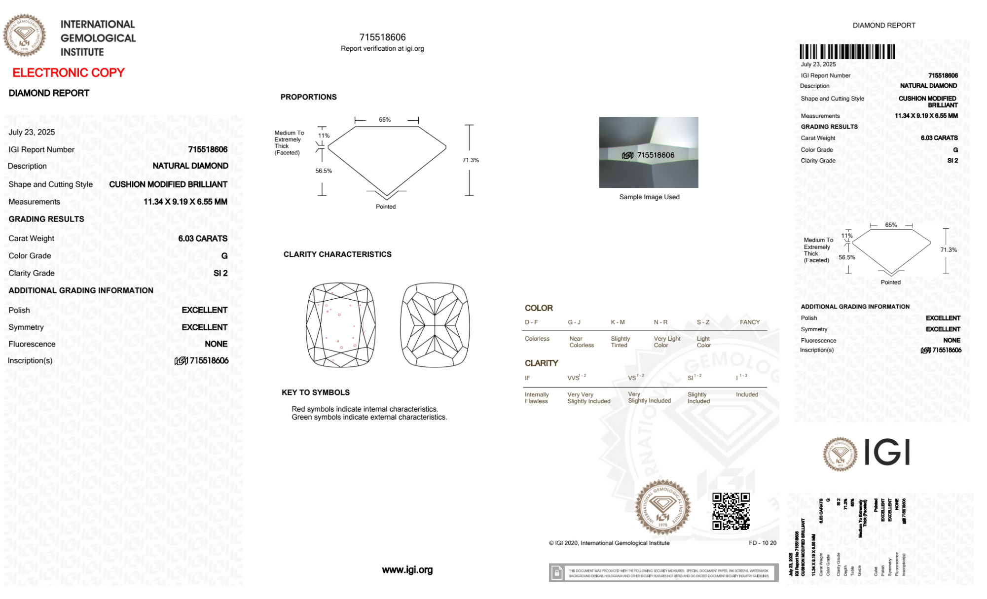 Your 6.03 carat Cushion natural diamond is graded G color (Near Colorless), and you can read more about G color diamonds here.