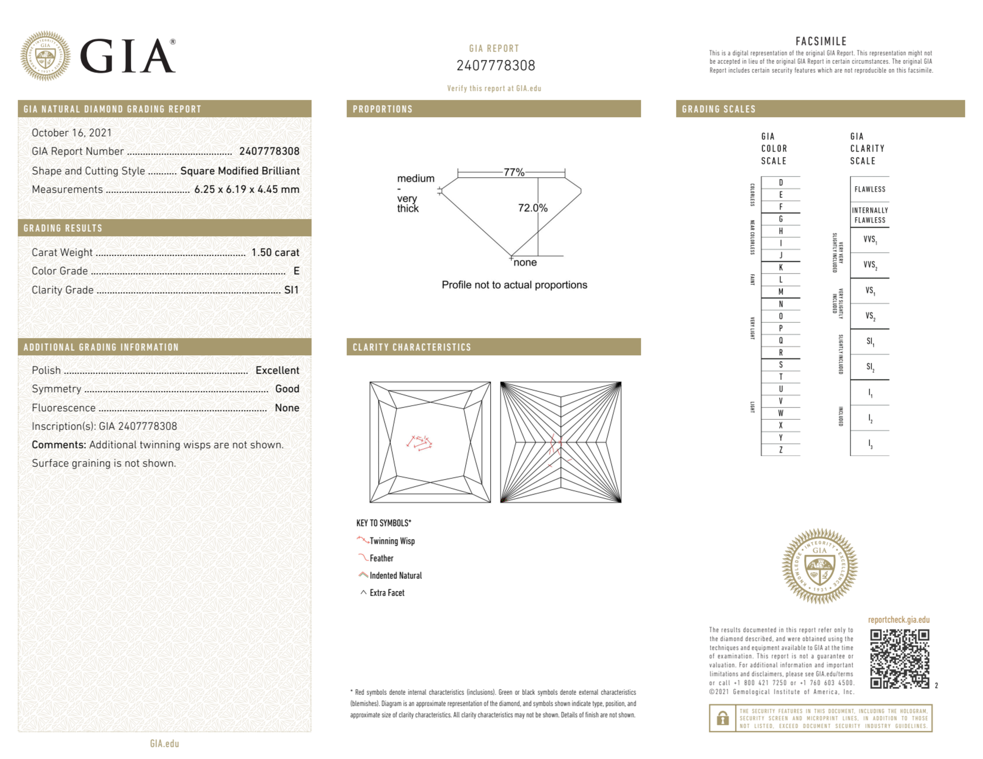 Your 1.50 carat Princess natural diamond is graded SI1 clarity, which stands for Slightly Included 1. Read more about SI1 clarity diamonds here, or learn more about diamond clarity in general here.