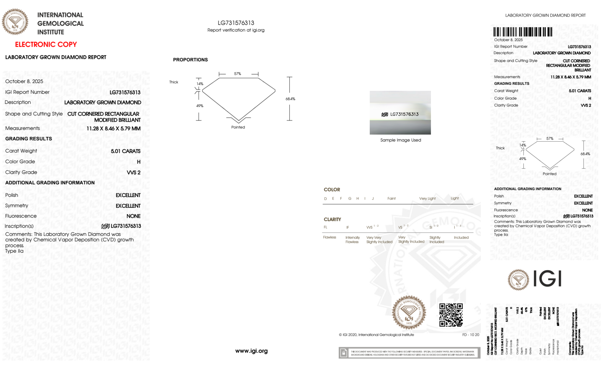 Your 5.01 carat Radiant lab diamond is graded H color (Near Colorless), and you can read more about H color diamonds here.